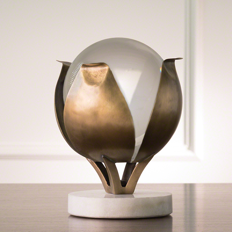 Inspired by an immense garden display from the Chatsworth House set in the heart of Derbyshire, the Chatsworth Ball has been brought down to a charming size with the ability to be displayed anywhere in your home. A white honed marble base sets the stage for antique brass "petals" that seem to flower from matching stems. Beautiful alone, but even more lovely when coupled with our 6-inch crystal sphere (sold separately).