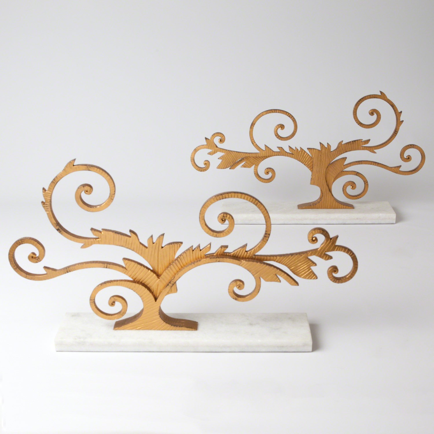 This elegantly tooled sculpture is constructed with multiple layers of scrolled metal. It is equally beautiful on the front and back sides. The stone slab base is white honed marble.