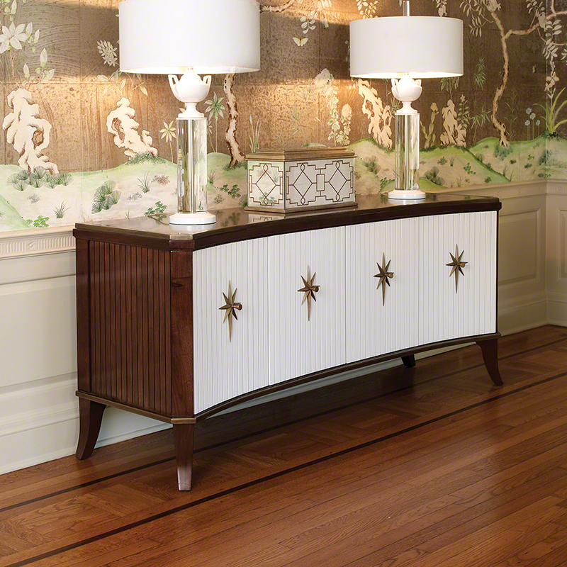 Klismos 媒體櫃融合英國攝政時期的設計風格,卻專為21世紀現代居家打造。兩側櫃門開啟後,各為17英吋寬的收納空間;中間兩門則是34英吋寬的儲藏區。所有隔間皆配有可調式木層板,並設有直徑2.5英吋的走線孔,方便媒體設備的佈線。每扇門均配有實心黃銅拉手,搭配加大星形背板,細節精緻。櫃體上下邊緣飾以同色系金色金屬飾條,四扇象牙白漆門板則完美襯托美國胡桃木的內外質感。