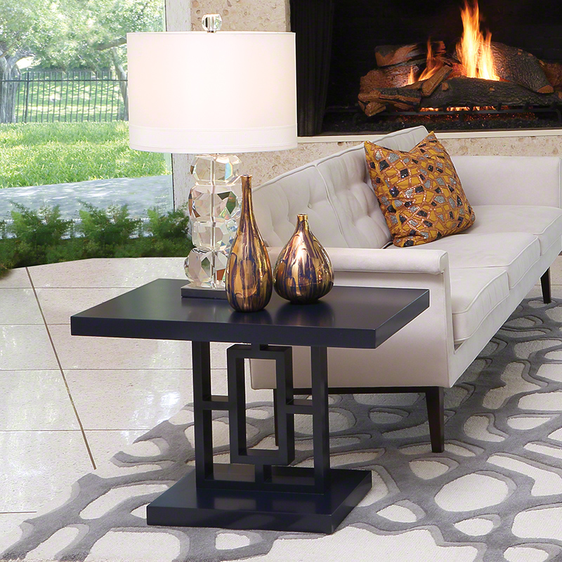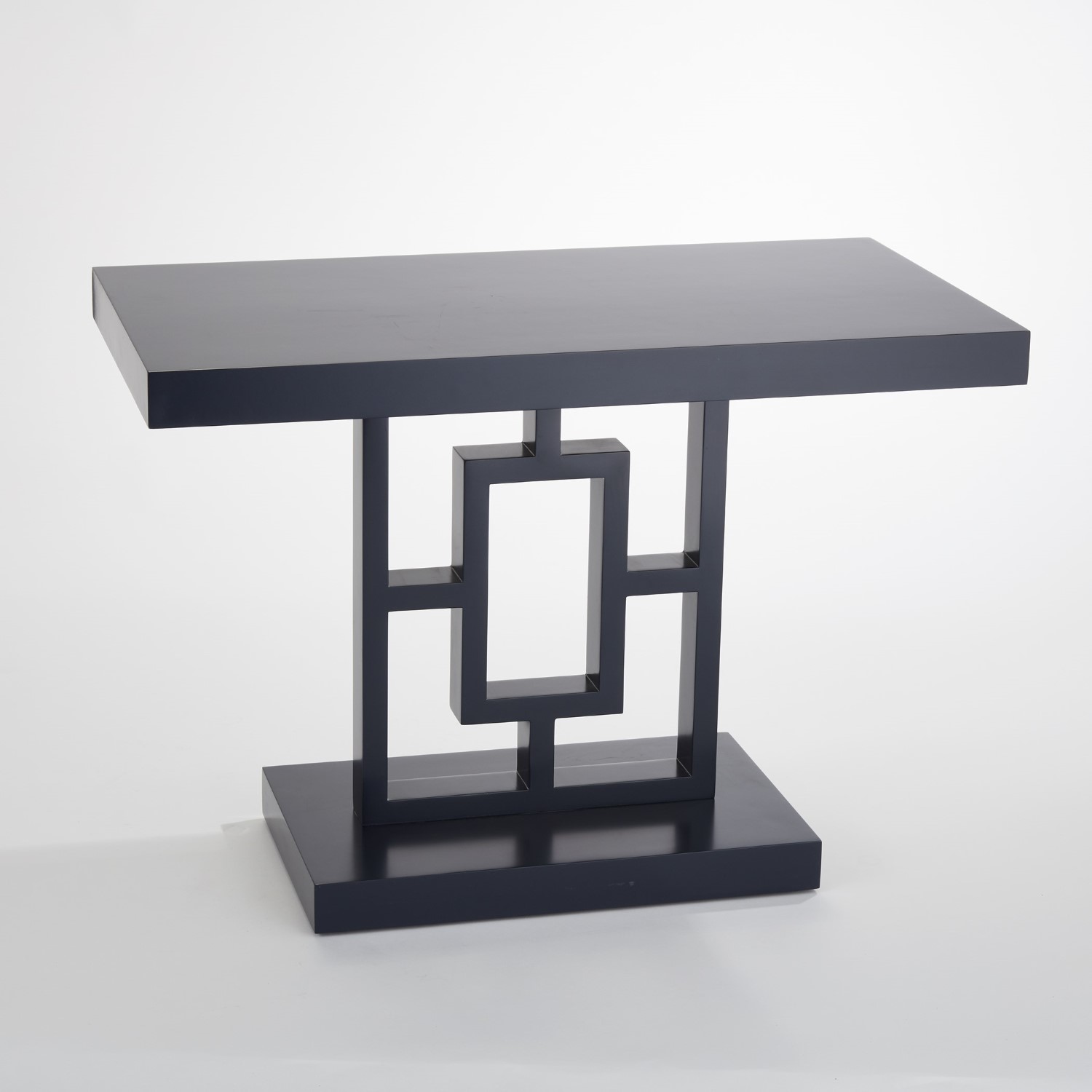 Linear graphic shapes make up the frame of this ink blue contract grade lacquered side table. Finished on all sides, this piece can anchor a seating group or seamlessly float in a room.
