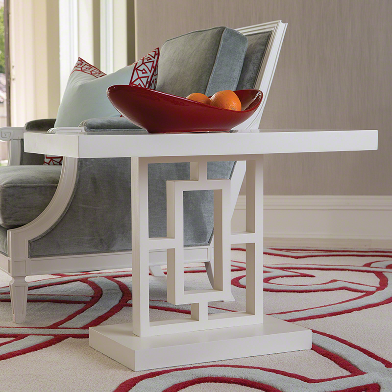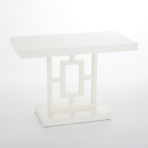 Linear graphic shapes make up the frame of this white contract grade lacquered side table. Finished on all sides, this piece can anchor a seating group or seamlessly float in a room.