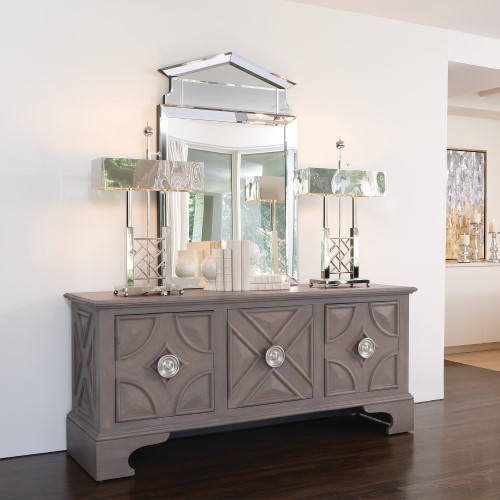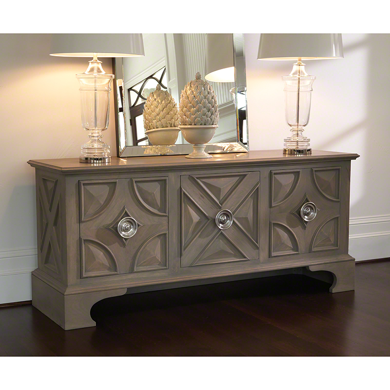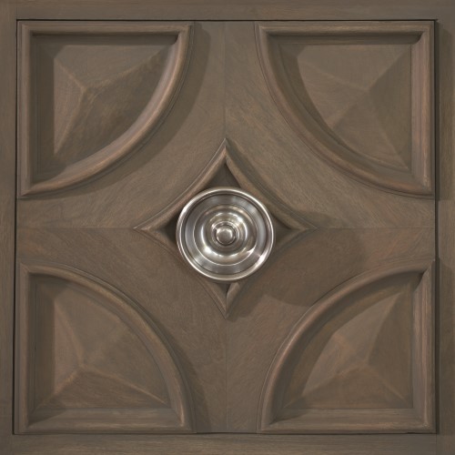 尺寸恰到好處,可安穩地承托今日的大型平面電視,既不張揚,也不隱沒。選用質地溫潤的芒果木,表面染以淺灰,仿若歲月拂過留下的風化痕跡。放大比例的門把以實心黃銅鑄造,再鍍以鎳銀光澤,如古董珠寶般低調閃耀。