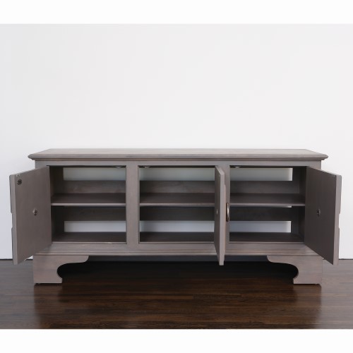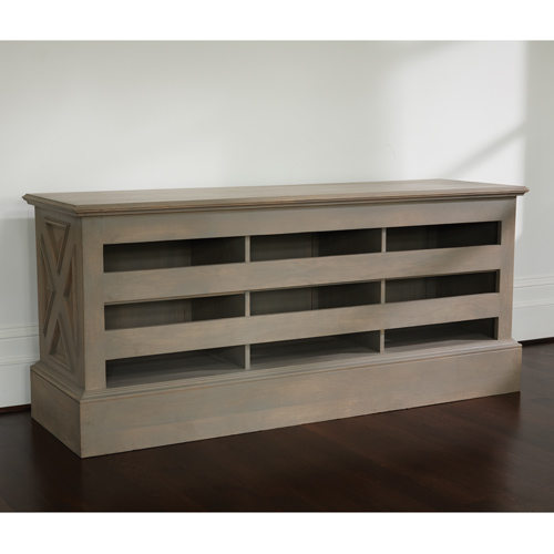 What do you get when you mix vintage Colonial styling and Global Views? Our Westmoreland Cabinet, of course! The cabinet, inspired by a blanket chest from the Williamsburg Museum collection, is an 18th Century throwback with its beautifully carved details! Featuring an adjustable shelf to accommodate your media components and a slat back to allow easy access to wiring and provide ventilation to help keep your audio and video equipment cool, the cabinet has all the charm of years past and is the perfect size to sit under your modern-day flat screen. Finished to perfection, the mango wood is stained in light grey to simulate weathered wood and the over-scaled door pulls are nickel plated solid brass.