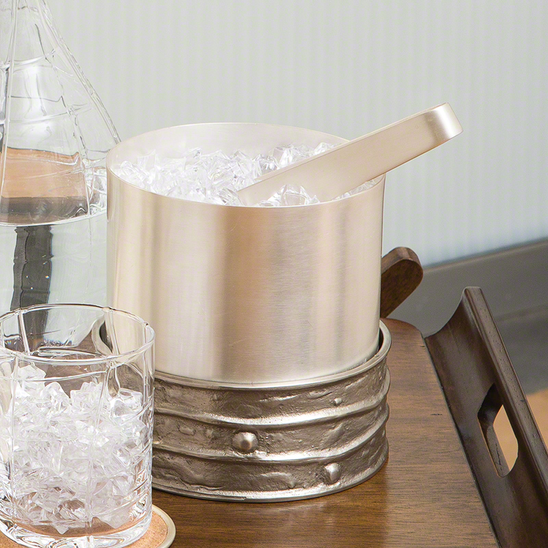 Textured and smooth. The satin nickel ice bucket sits in the cast Abbey holder. The removable cylinder insert can hold ice or a bottle of wine.