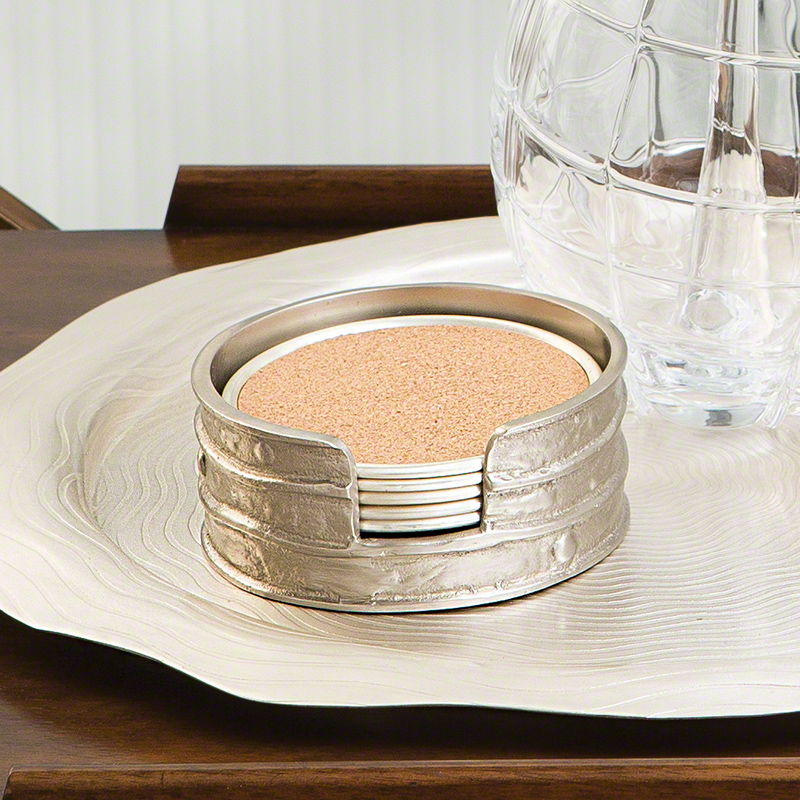 The Abbey pattern is cast into the base of the coaster caddy which is finished in antique nickel. The Abbey caddy holds six satin nickel coasters lined top and bottom with cork.