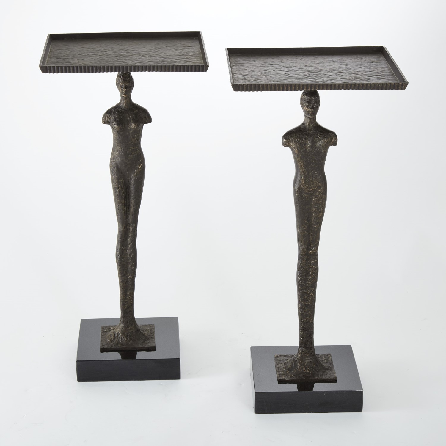 Our Venus and Apollo tables are standed tall on a black granite base. A shallow lipped iron top sits on top of the figure giving a sleek surface.