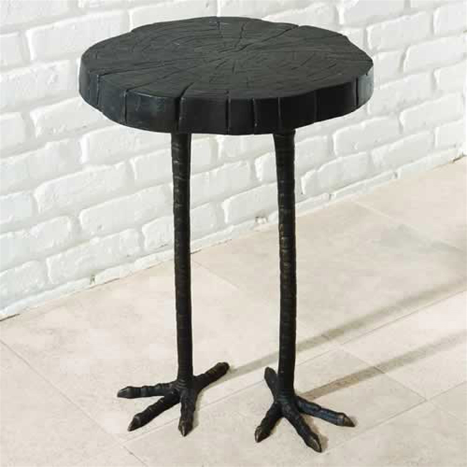 Iron ostrich legs and a wood cut look iron faux bois top make this little side table a whimsical conversation piece. Felt on bottom of feet to protect your floors.