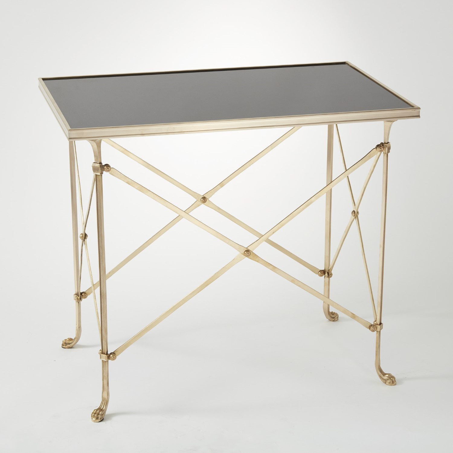 Spindly paw-footed legs at the corners of the Rectangular Directoire Table are linked by crosses of thin brass bars, each joined with a detailed knob. The result is a spare, architectural structure that supports the thin black marble top of this appealing side table. A brass finish on the metalwork enhances the traditional feel of the accent table for a touch more elegance.
