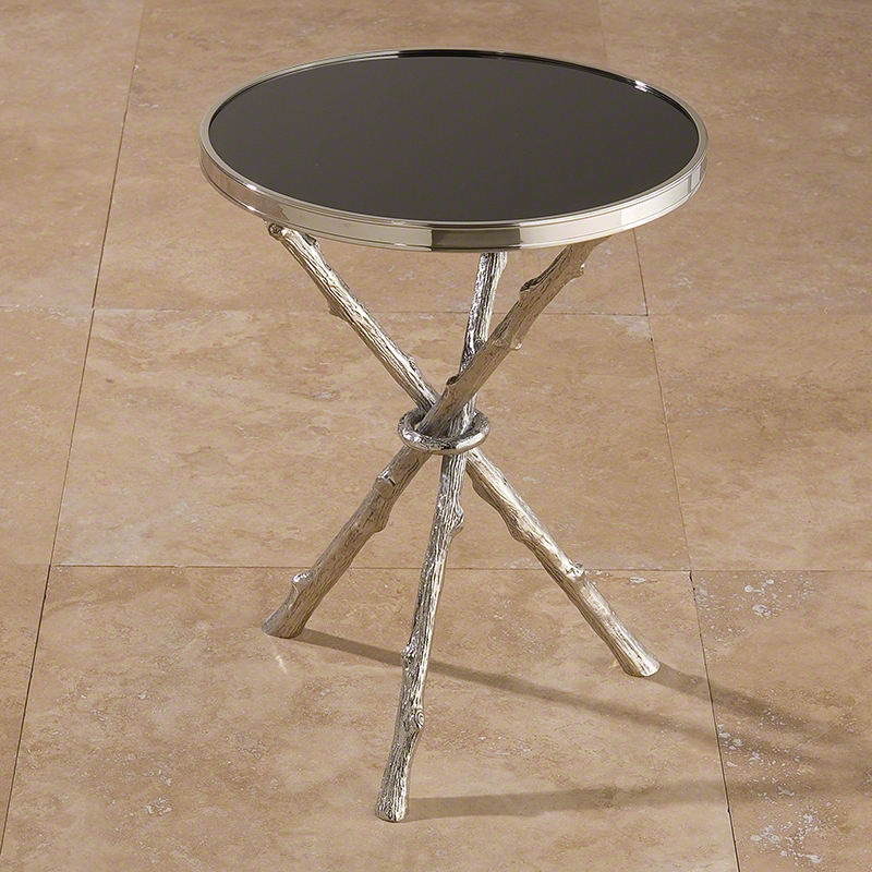 Referencing the natural world, this beautiful table has a twig textured nickel frame and is topped with a round black granite surface. The simple beauty of the materials shines through in this timeless design.