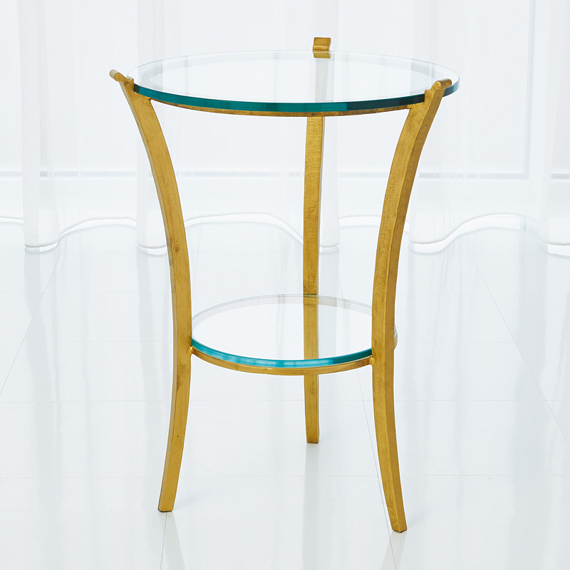 The gently curved two-tier Saber Table holds tempered glass surfaces in its grasp. Forged iron gives this tripod table strength and durability. Available in Antique Gold and Natural Iron finishes.