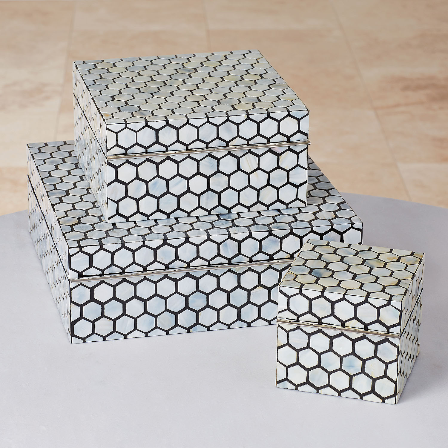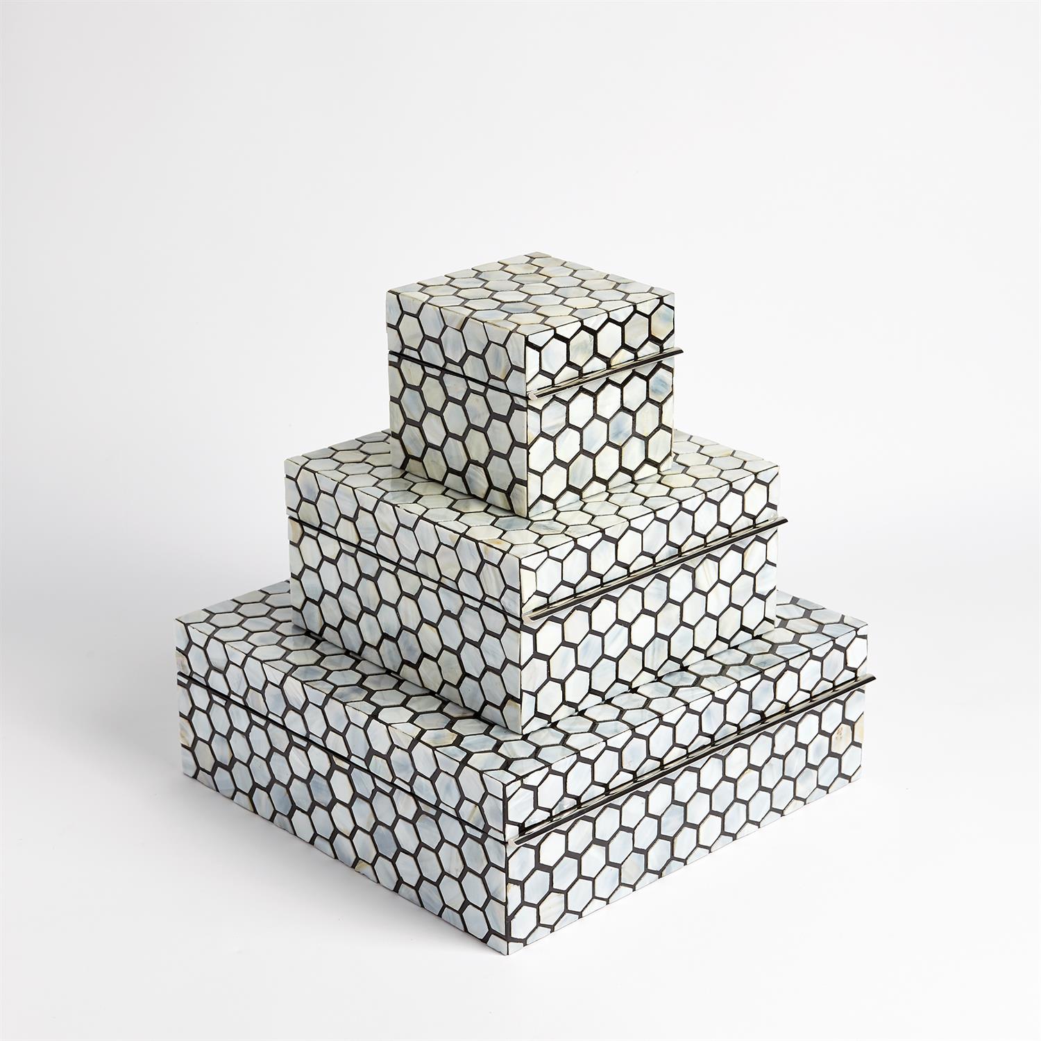 Mother of Pearl box is adorned with a honeycomb pattern of frosted pale blue hued mother of pearl protected by a lacquered finish. Piano hinged, finished black interior.