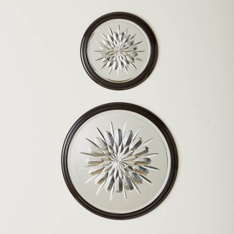 星星花紋圓鏡是一個奇妙且多功能小物!! 星星花紋圓鏡的中央花紋是從背面雕琢在鏡面玻璃上,因此鏡子的表面呈現光滑平整;除了可當鏡子以外,也是您梳妝台上的美麗托盤,鏡子的圓木以黑色蠟染的橡木飾面框架製成,簡約又時尚。