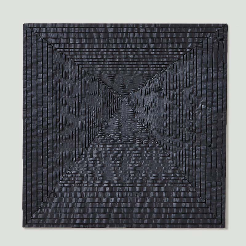 This painstaking carving process is aimed to show a different side of the natural beauty and texture of wood that is not usually seen on plain surfaces. The peaks and valleys created convey an abstract texture that is organic and sculptural in form. Painted in black, the texture mimics that of delicate charcoal with none of its instability. Constructed of Gmelina wood, a cousin to Beechwood. Matte black finish.