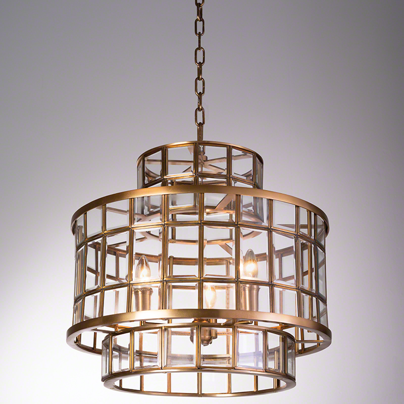 Each pane of glass in the Alexandria Hall Pendant has been painstakingly hand beveled, enhancing the reflection and refraction of light emanating from the fixture. Solid brass frame.