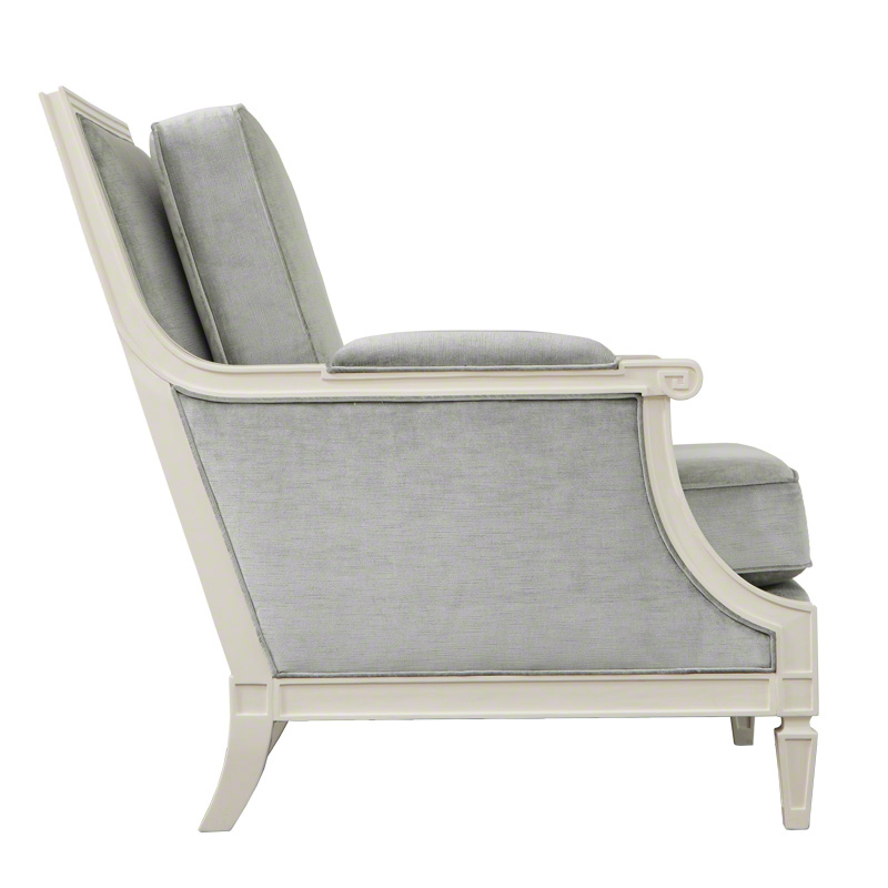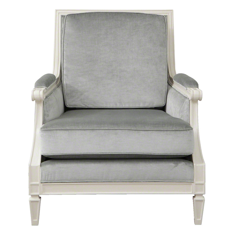 This beautiful furniture is French-inspired with an ivory lacquered hardwood frame, an exaggerated spade foot, and is upholstered in muslin.