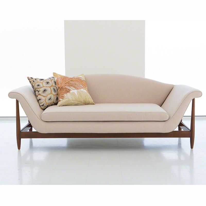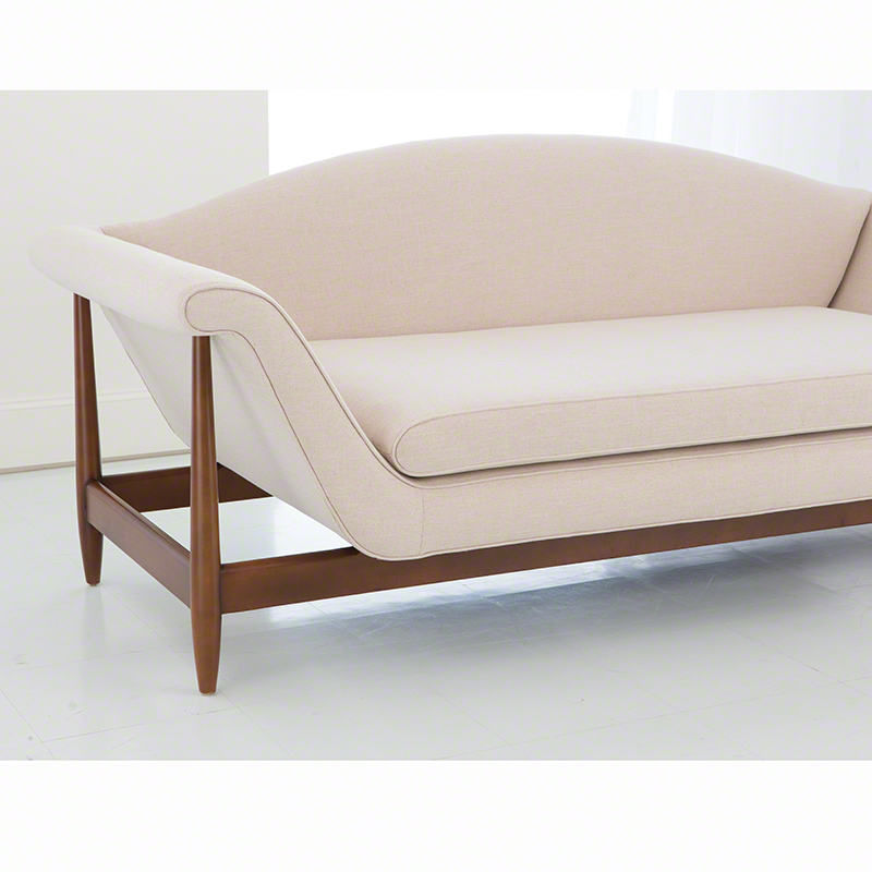 A tribute to mid-century modern style, Studio A Home′s Wagner sofa appears to float on an exposed beech wood frame. The exaggerated curve of the arms rest on the vertical frame posts. The curved back and single bottom cushion add to the elegant lines of this unusual profile.