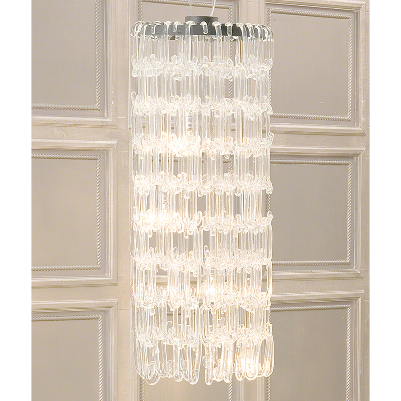 The "C" Chandelier is a 48" work of art! Made up of 396 hand blown clear "C" glass pieces that connect to each other like a chain. When lit the warm light radiates out making it a definite statement pieces.