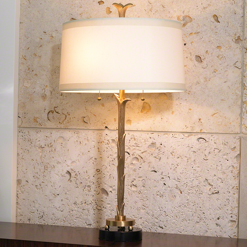 這盞黃銅燈飾沿側緣綴以扇形葉片浮雕,層層堆疊,宛如葉浪緩緩攀升。穩重的黑色花崗岩底座搭配雙拉鍊燈頭,將古典質感與實用機能巧妙融合。