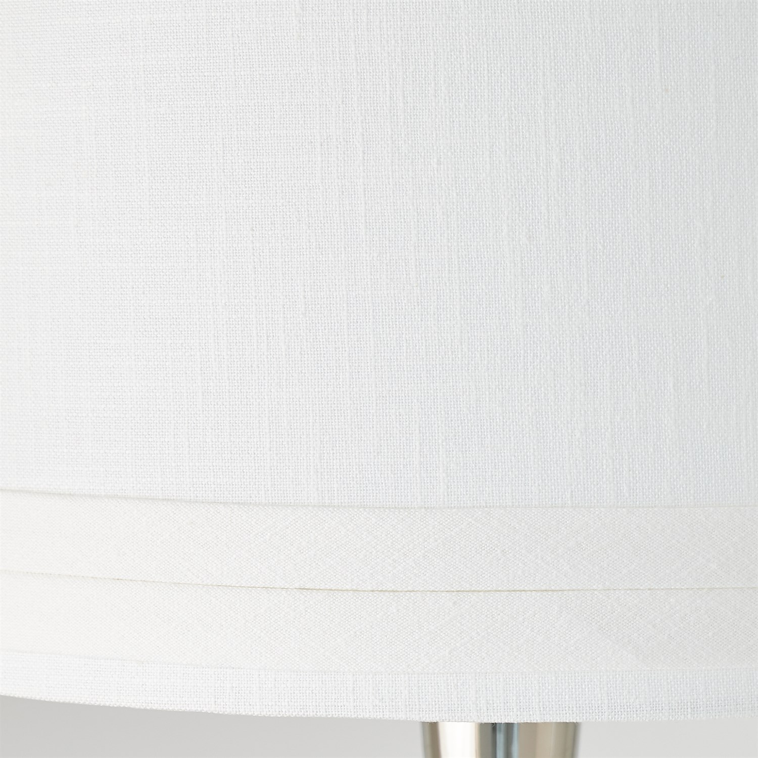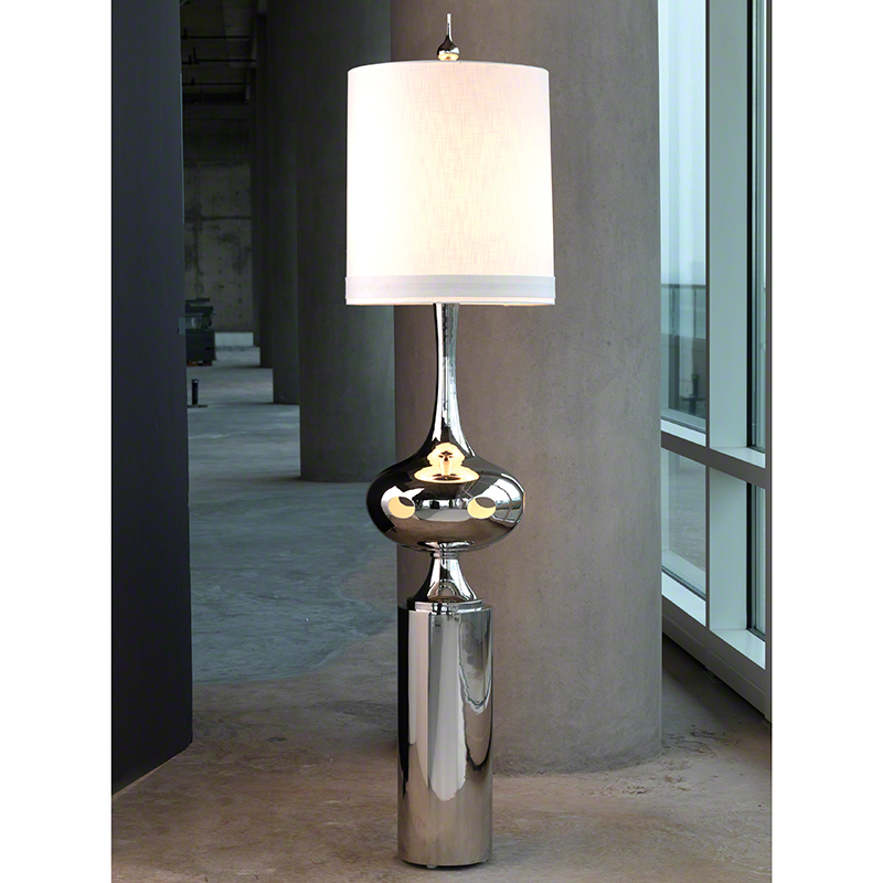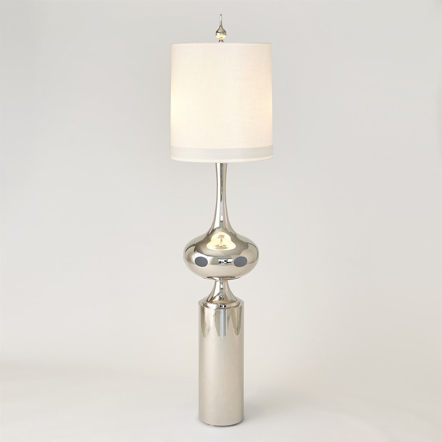 The lamp’s midsection features a shiny silver finish with an intricately hollowed-out design that glows softly under the illumination of two bulbs at the base. Paired with a pure white linen drum shade and a bulb-shaped finial on top, the overall form resembles a futuristic work of interstellar art. Mysterious and avant-garde, it’s a true statement piece that will turn heads in any space.