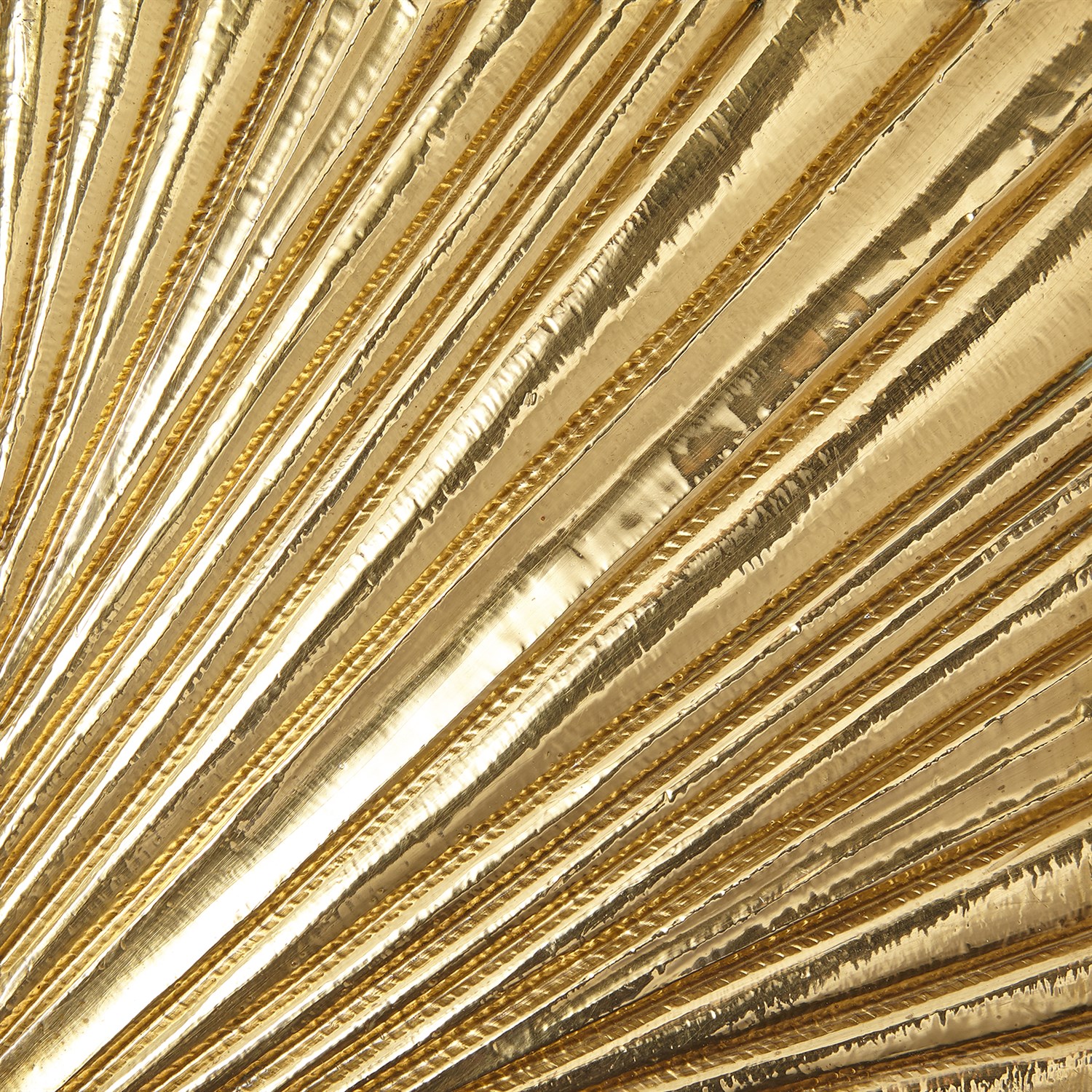 A dimensionally folded fabric pattern is created by hand applied brass metal cladding over wood. Hangs on a standard cleat system, included.