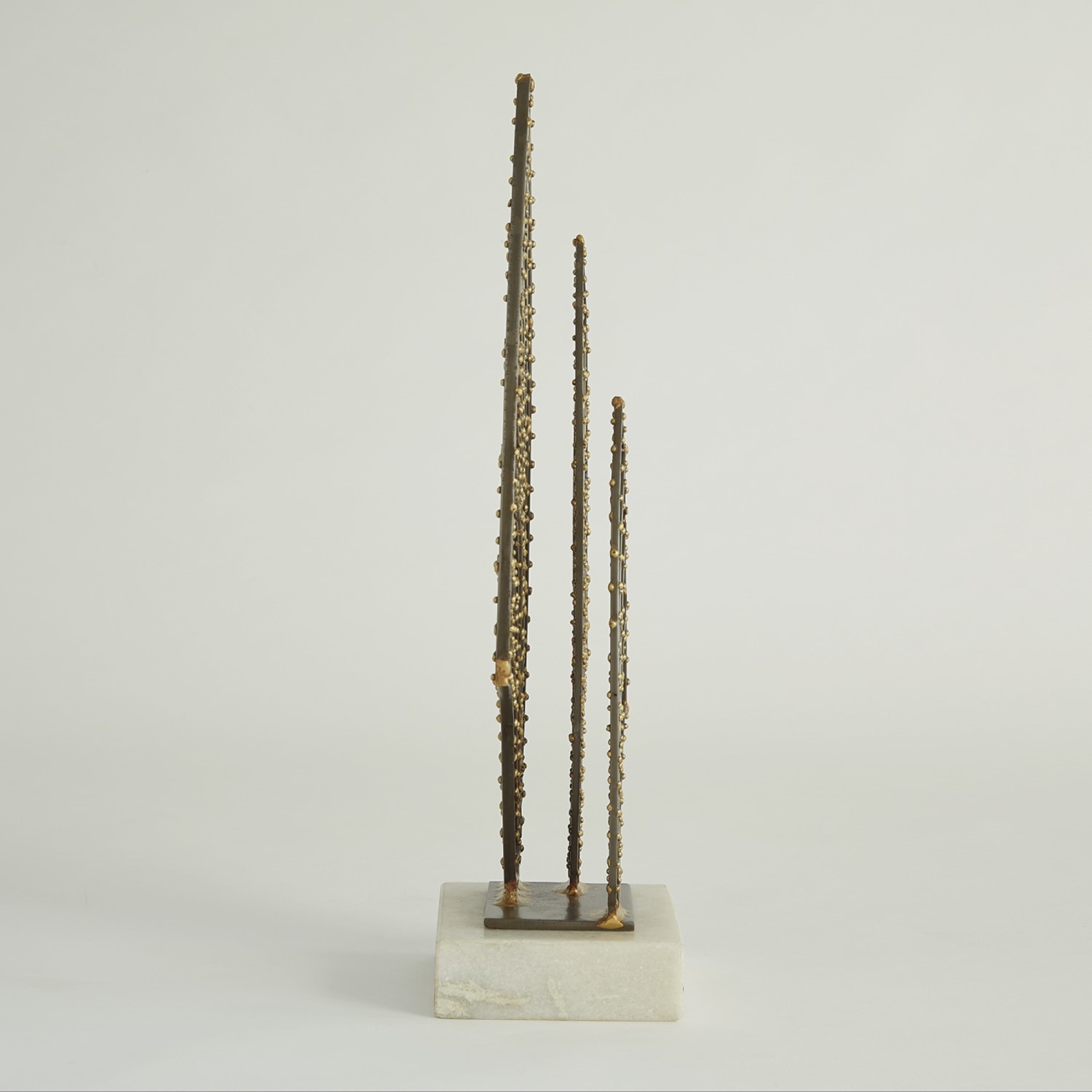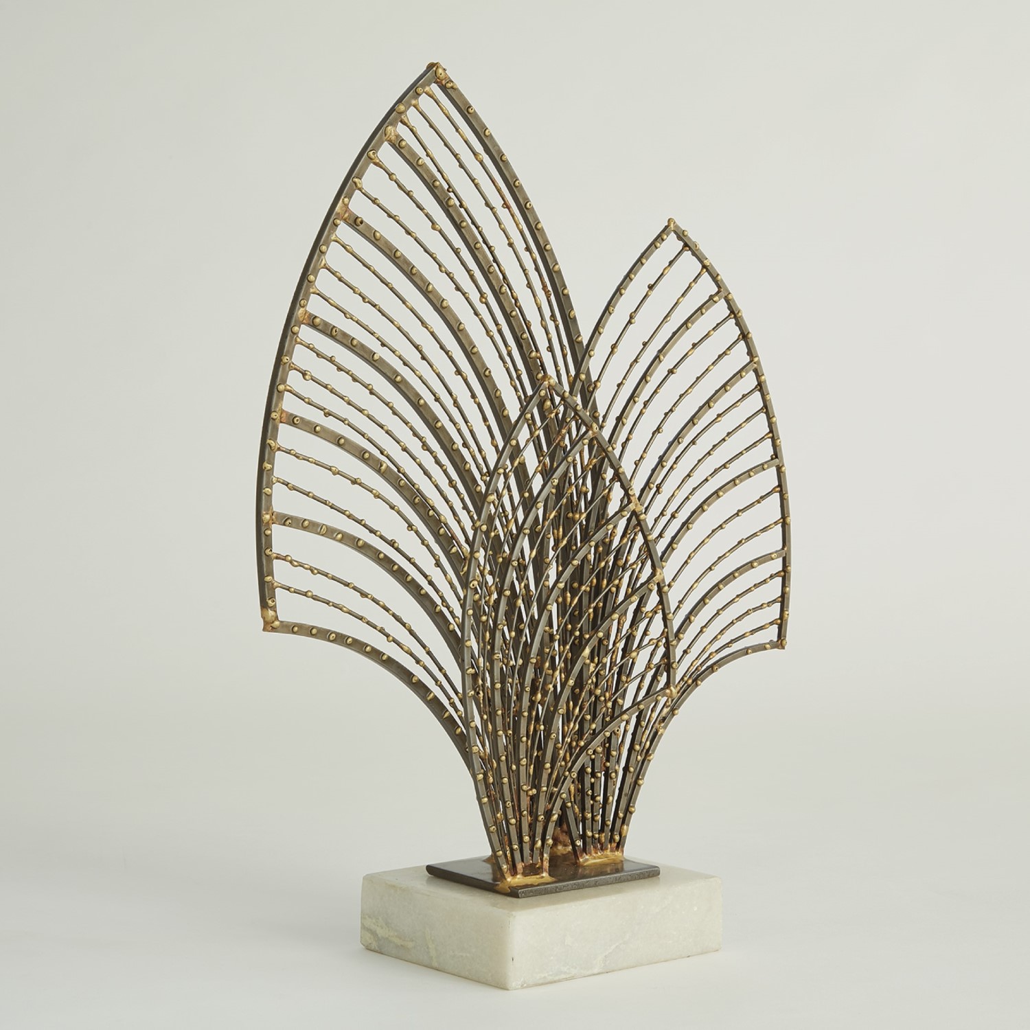 Inspired by the beautiful lines of a layered fan, the Alva Sculpture epitomizes modern elegance. The stunning bronze and brass design contrasts with the sleek lines of its white stone base, while its eye-catching shine makes it the perfect bookcase showpiece.