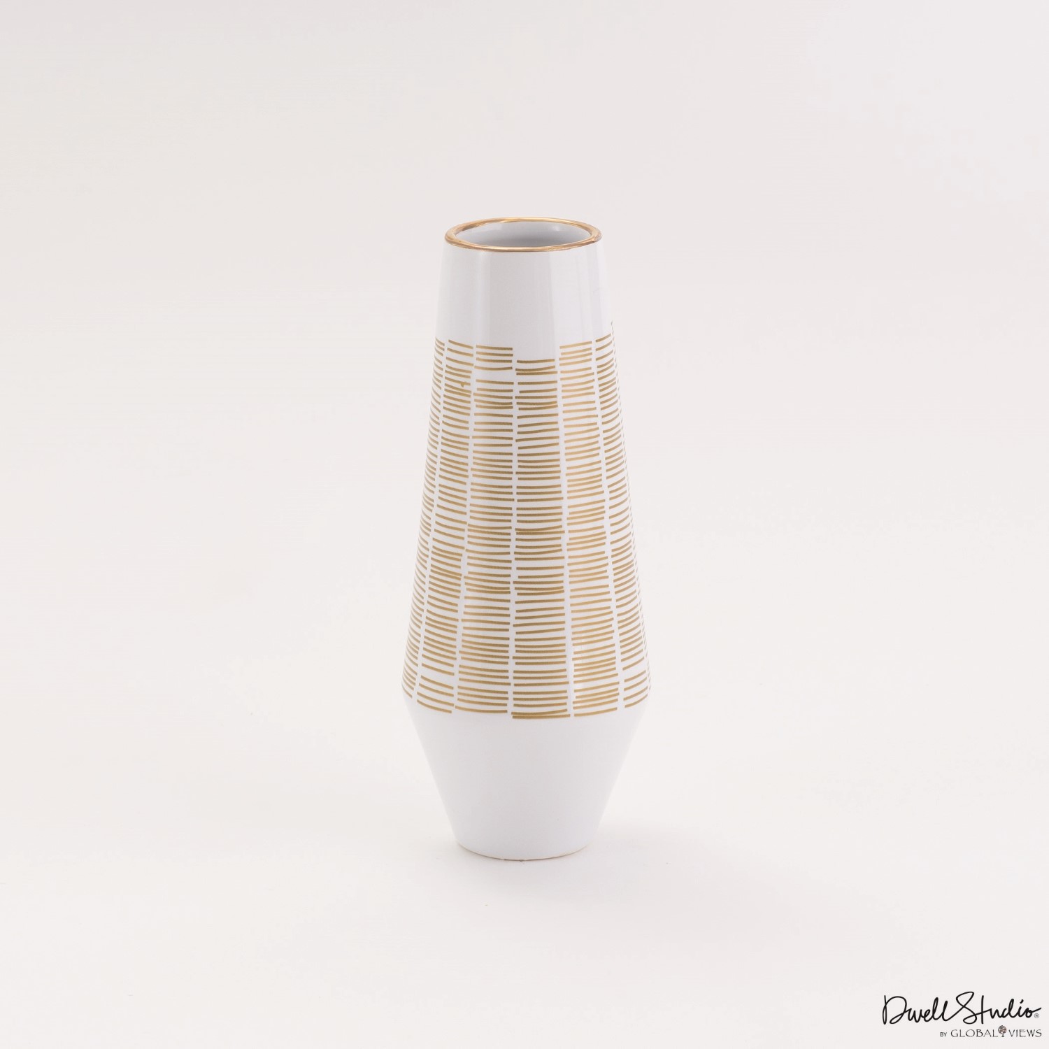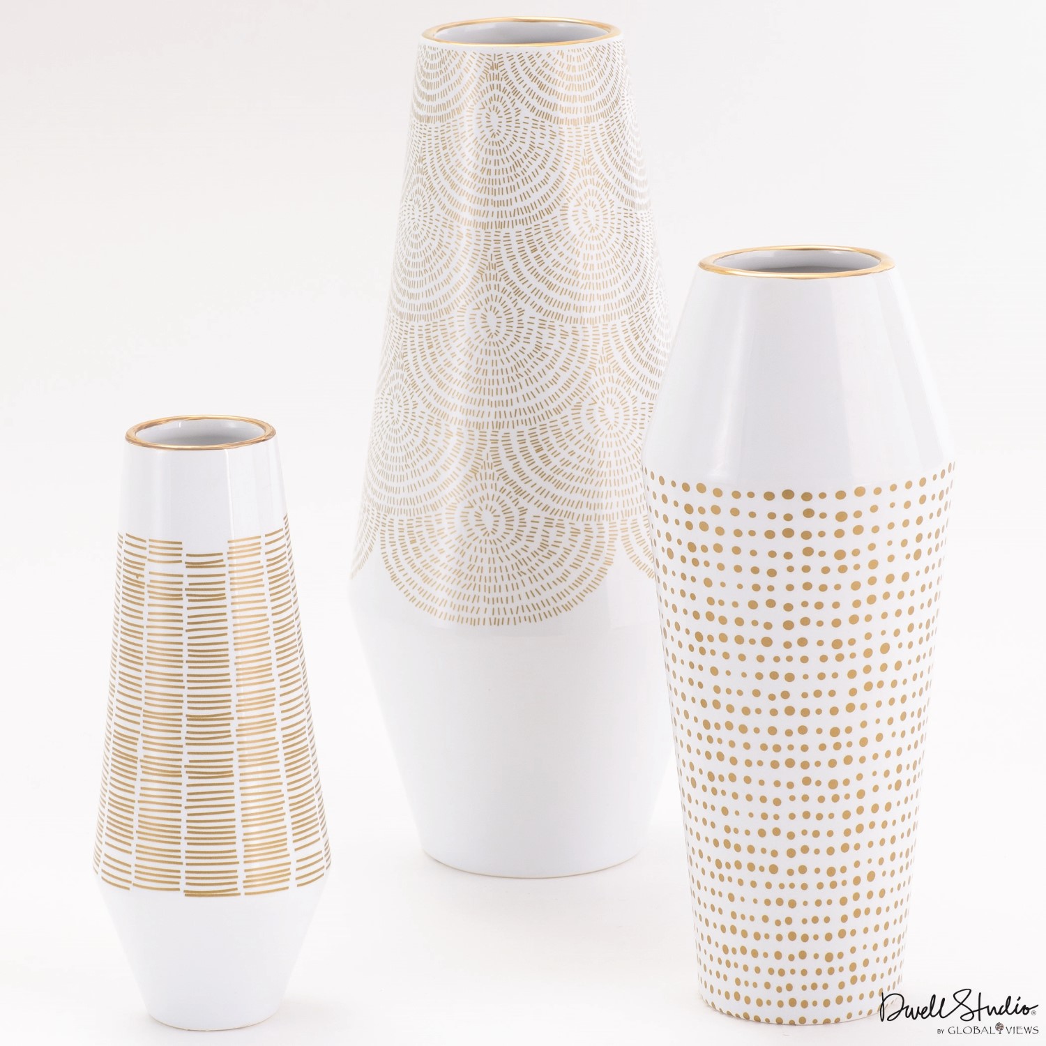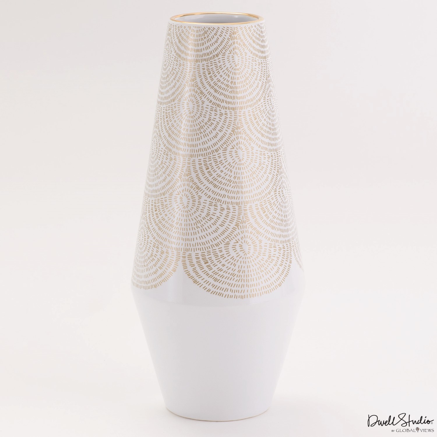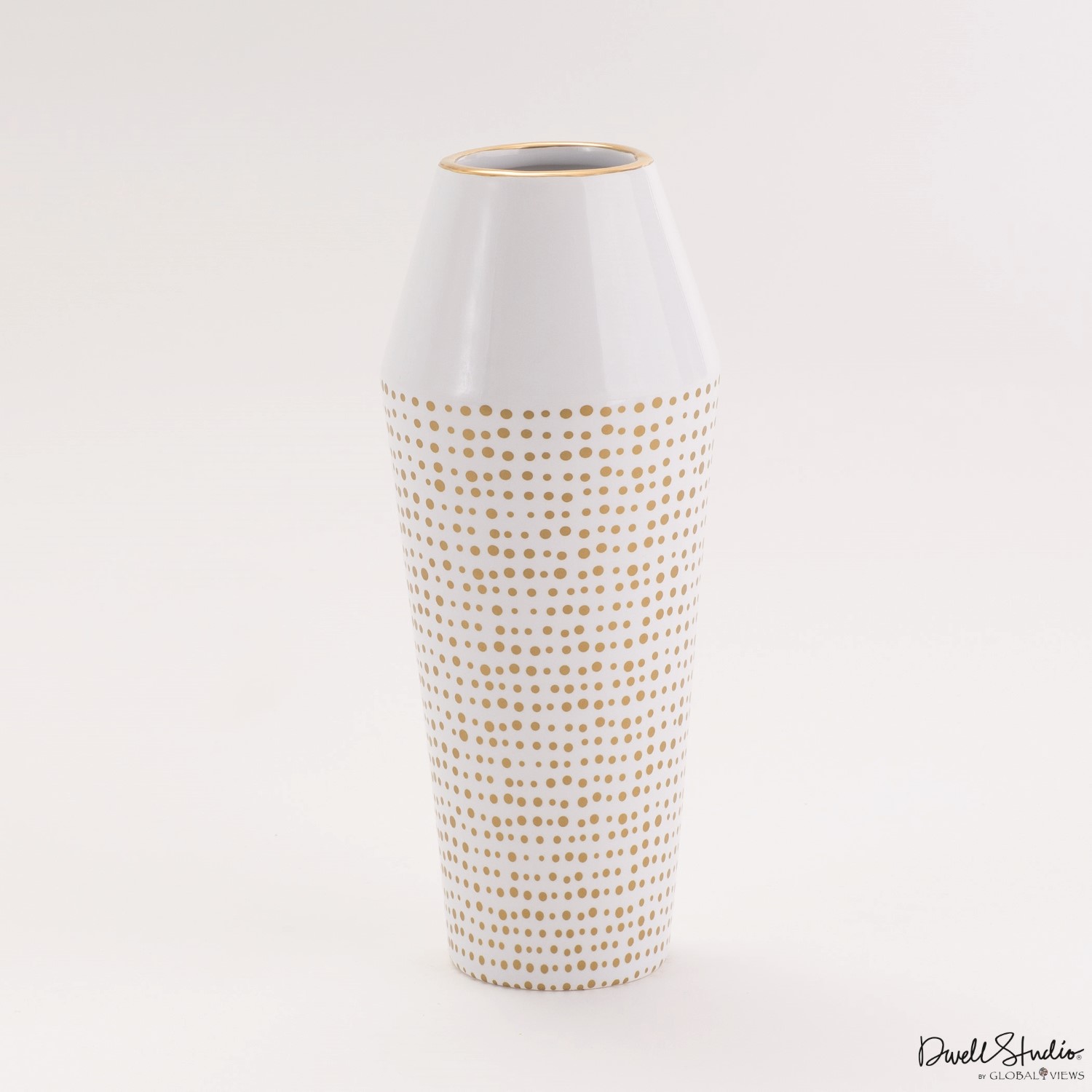 Golden dots cascade from the top to the base, enhancing the pristine white vase and creating a graceful backdrop for fresh blooms.