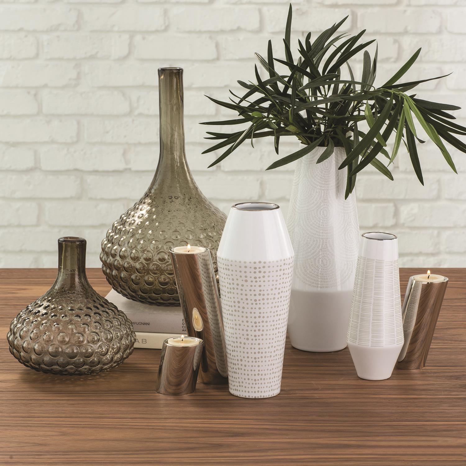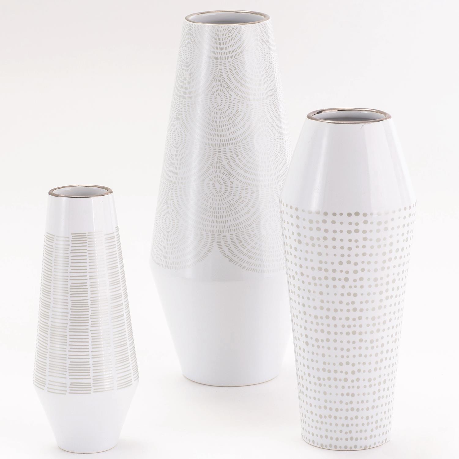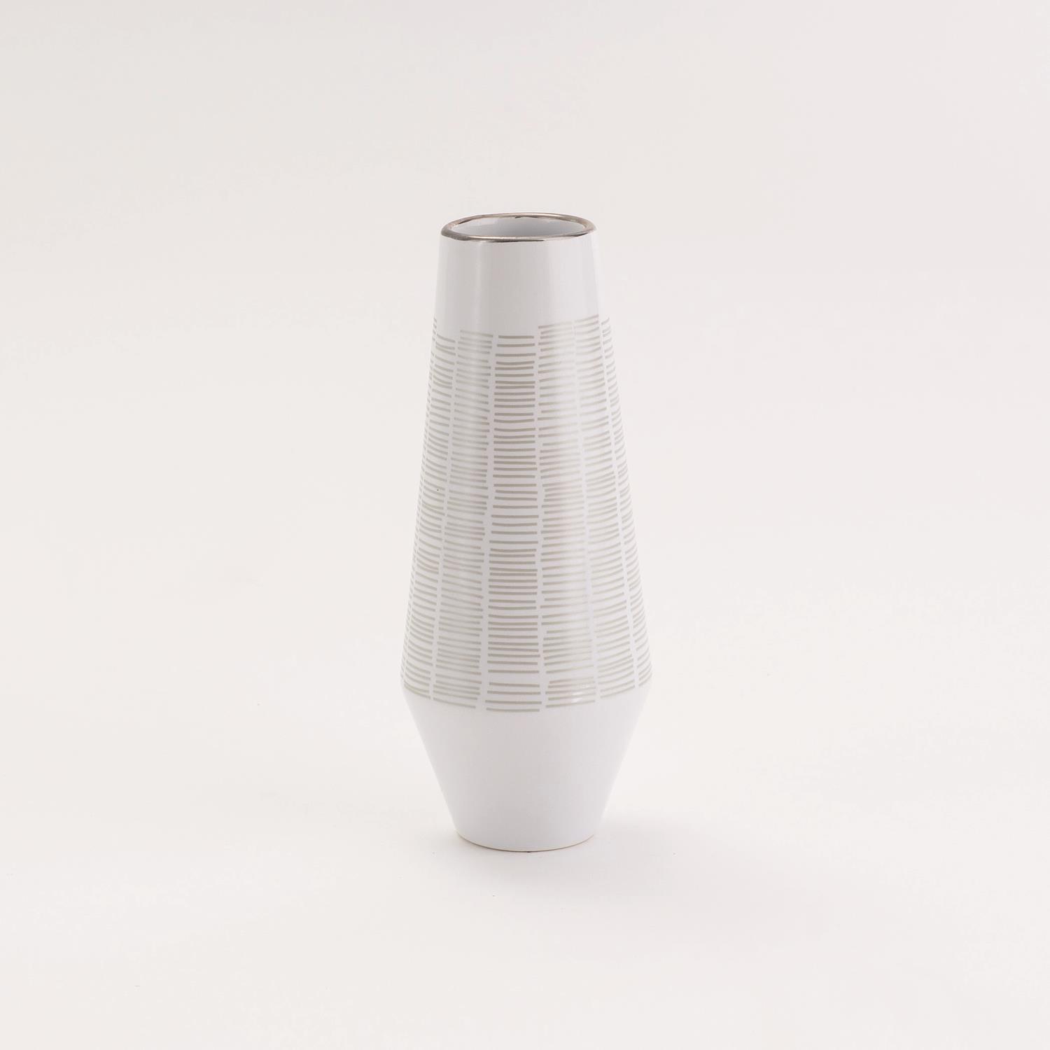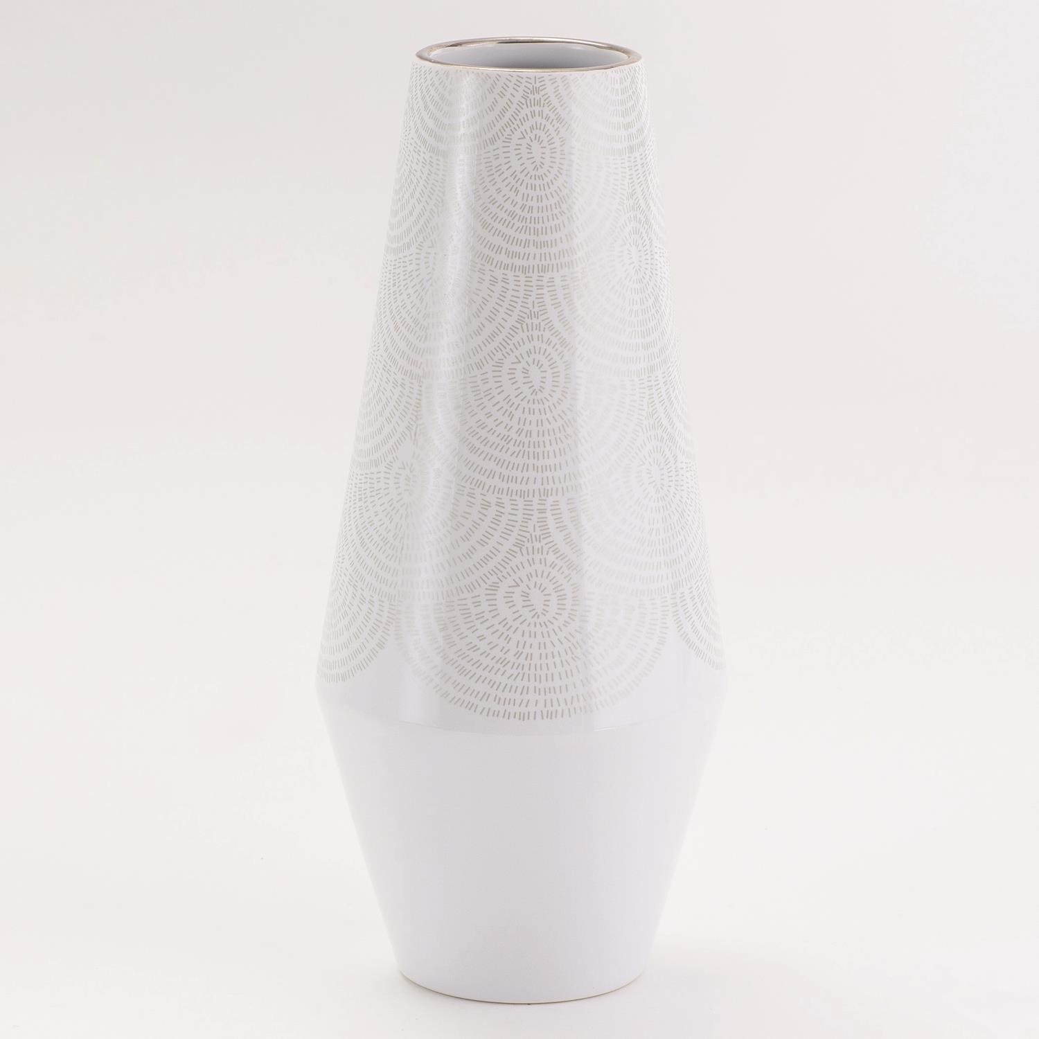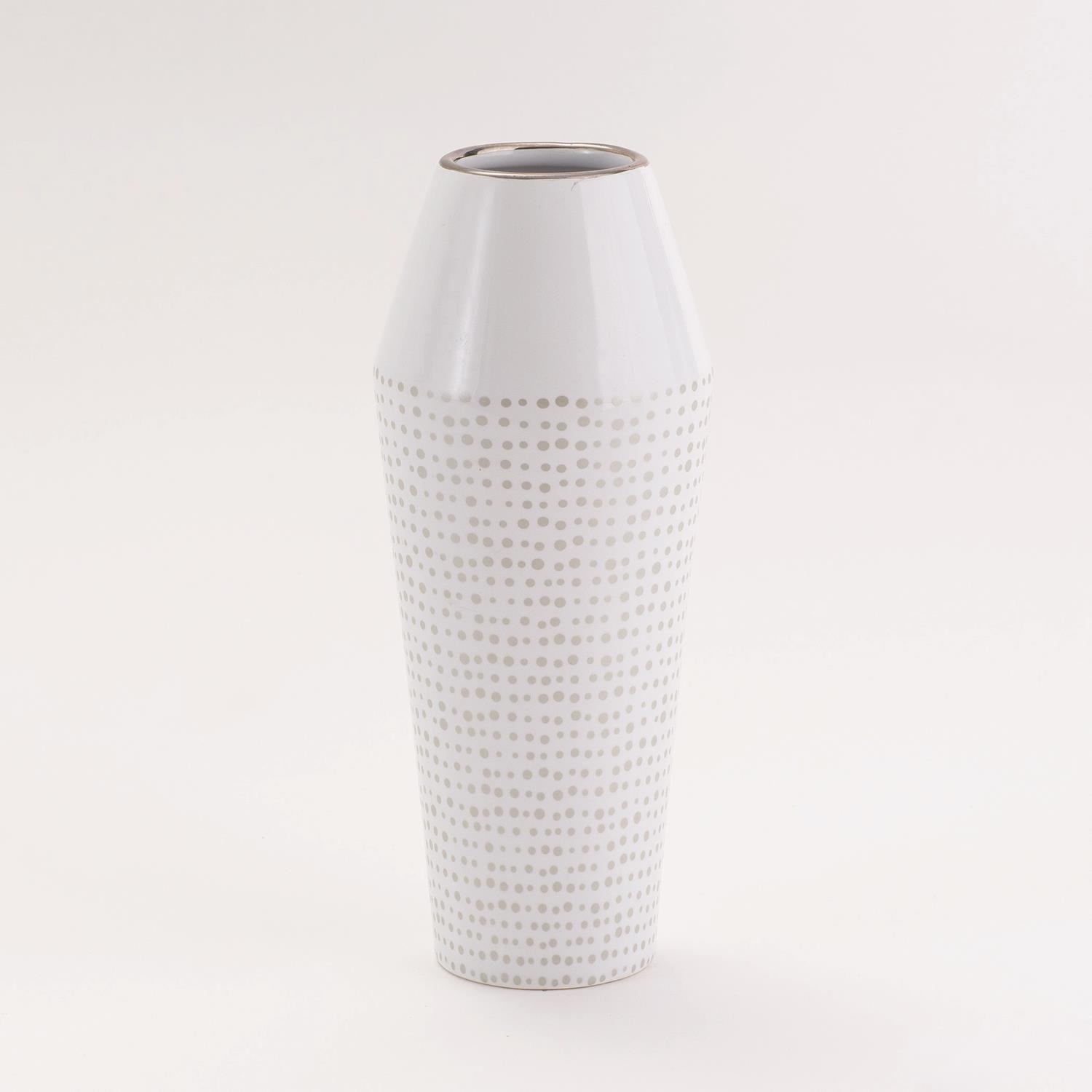 Silver dot matrix from the top to the base, enhancing the pristine white vase and creating a graceful backdrop for fresh blooms.