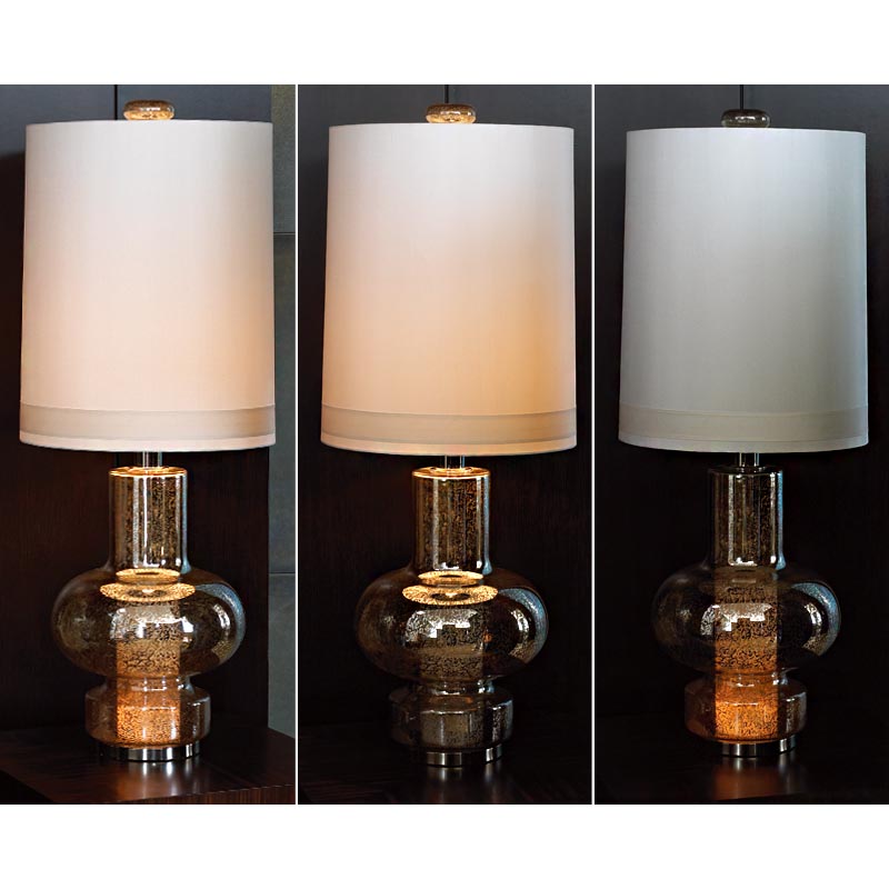 The lamp features a beautiful antique mercury glass body, a frosted glass inner cylinder, and a three-way switch that allows for multiple lighting options: