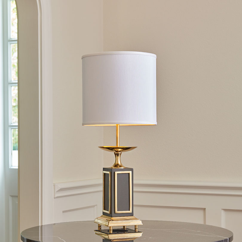 Grecco lamp is made of soft brushed satin charcoal steel with shiny brass accents. Round white drum shade. Holds one 60W "A" bulb.