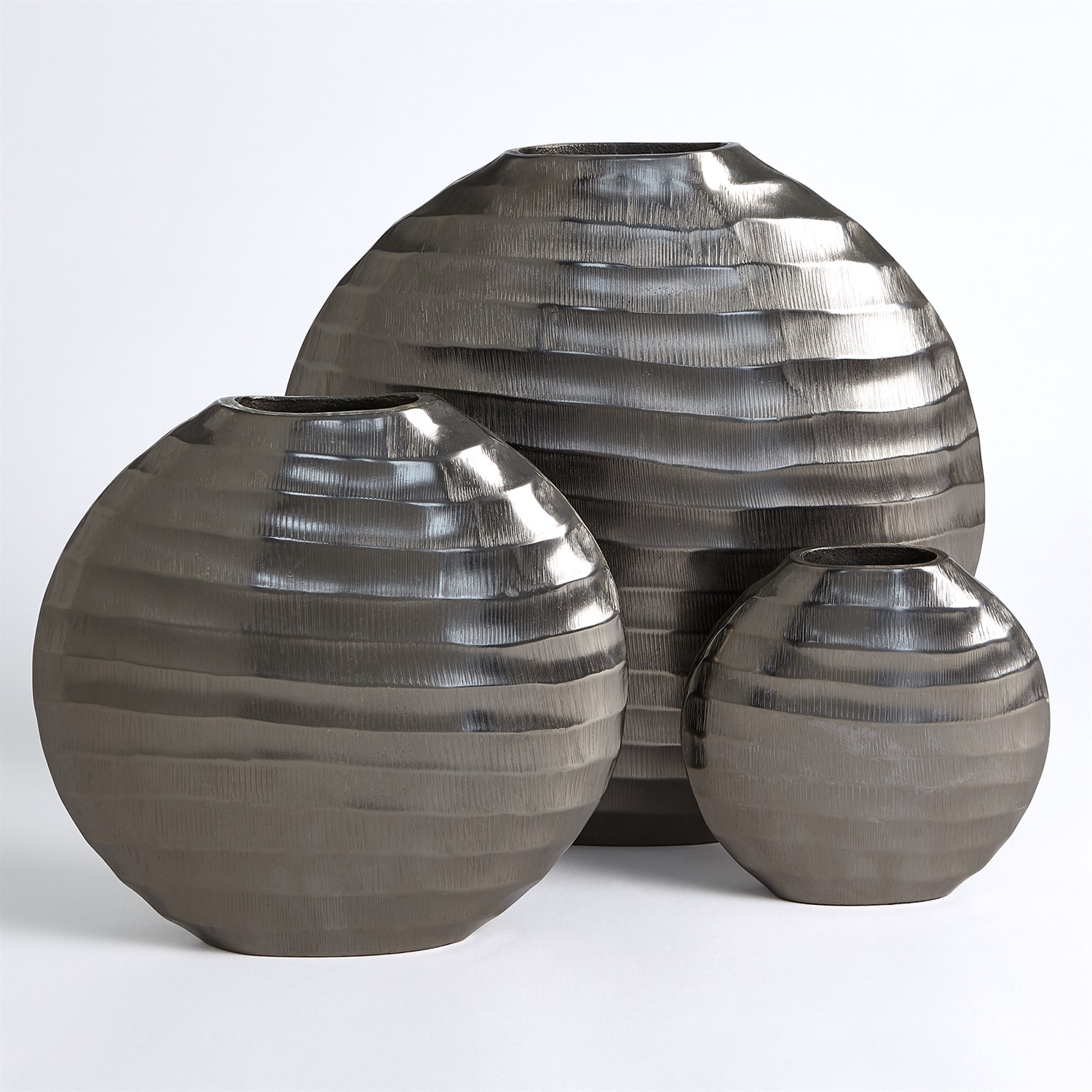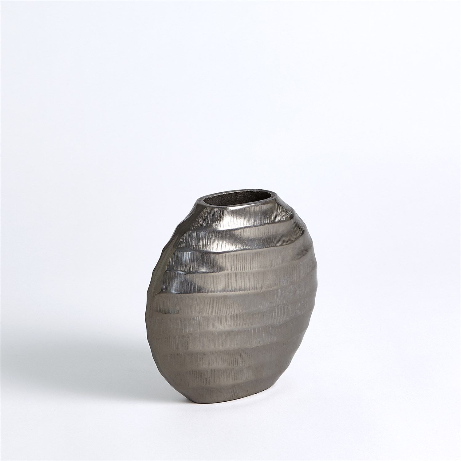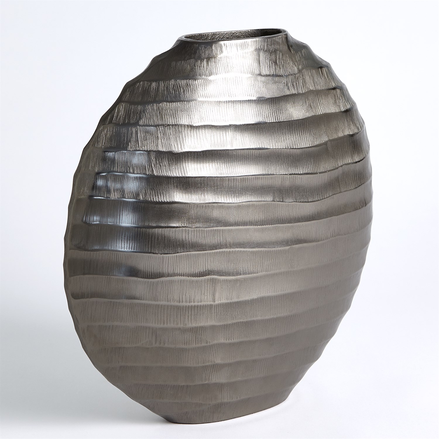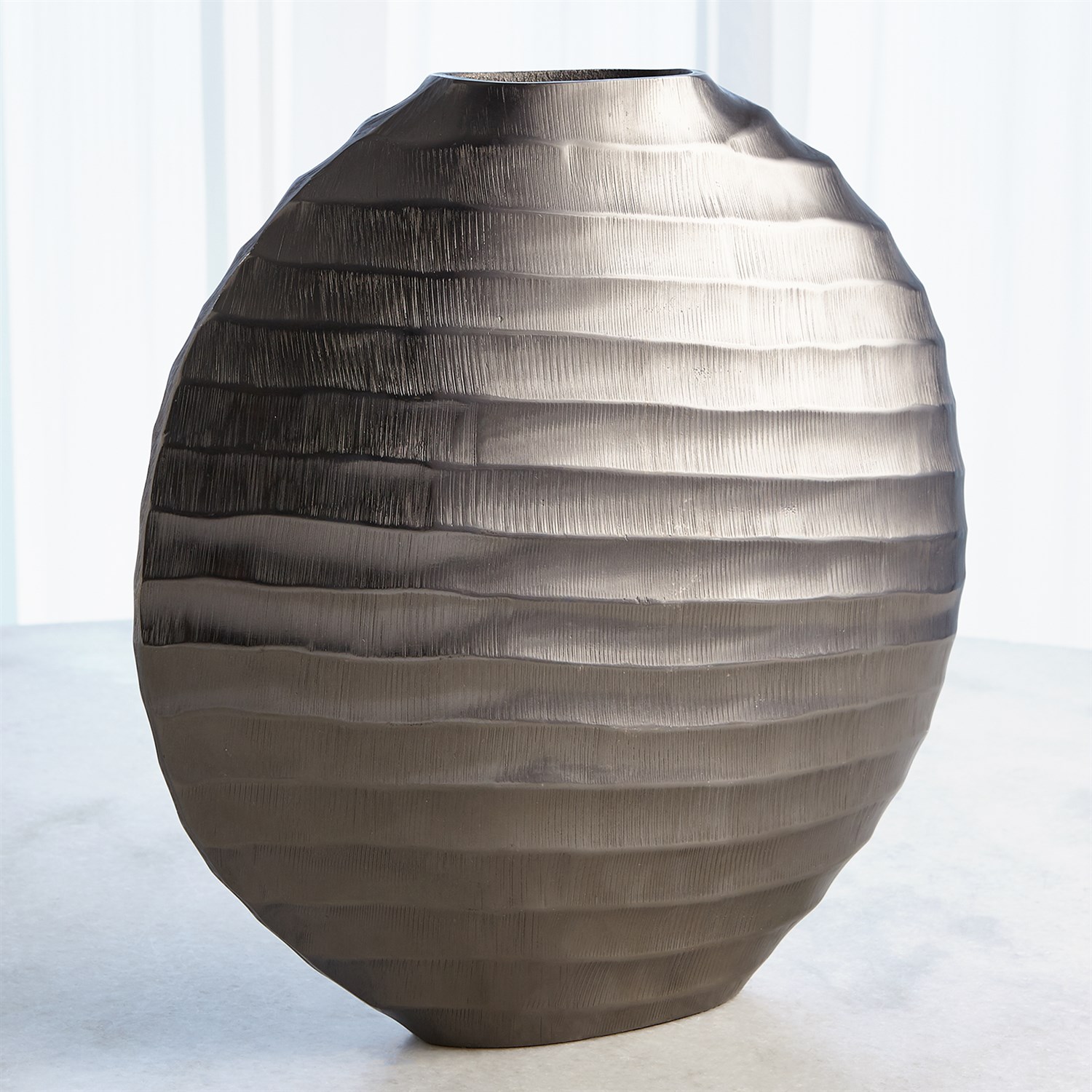 The Chased Oval Vase is made of chiseled aluminum with a black nickel finish.