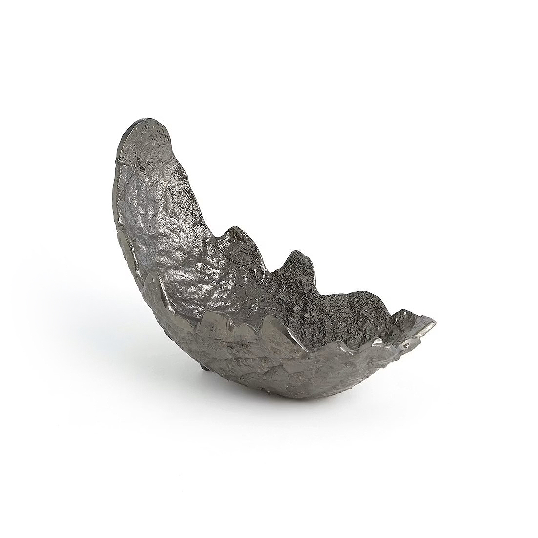 Cast aluminum in a free-form shape of a leaf with gunmetal finish.
