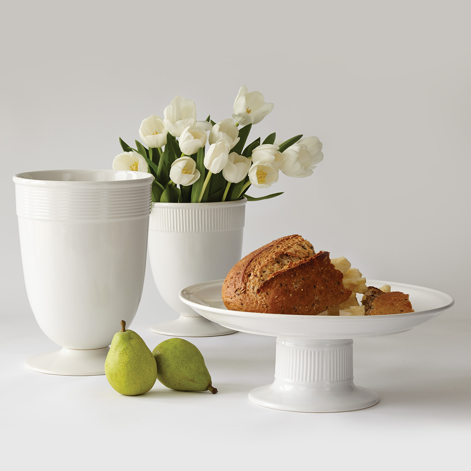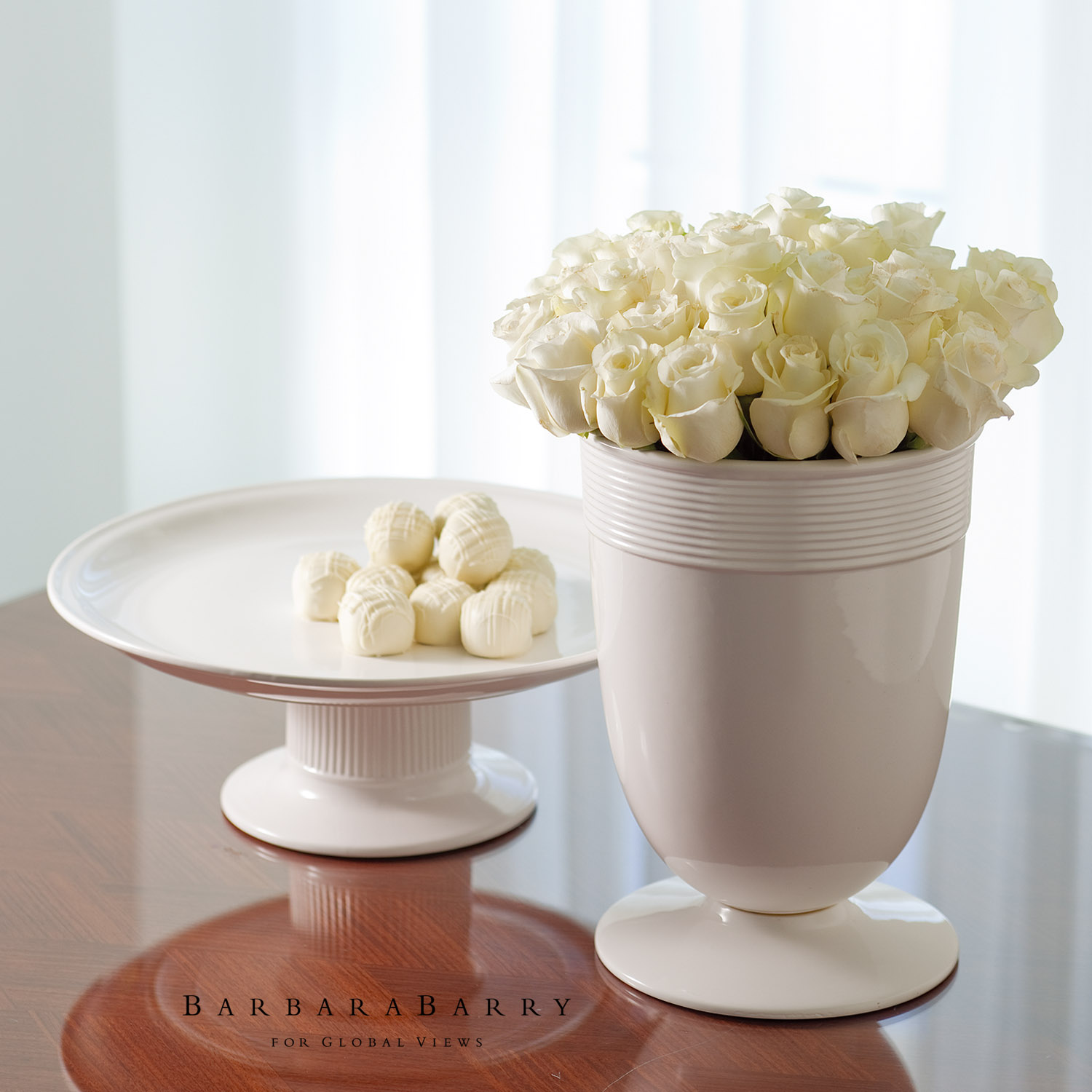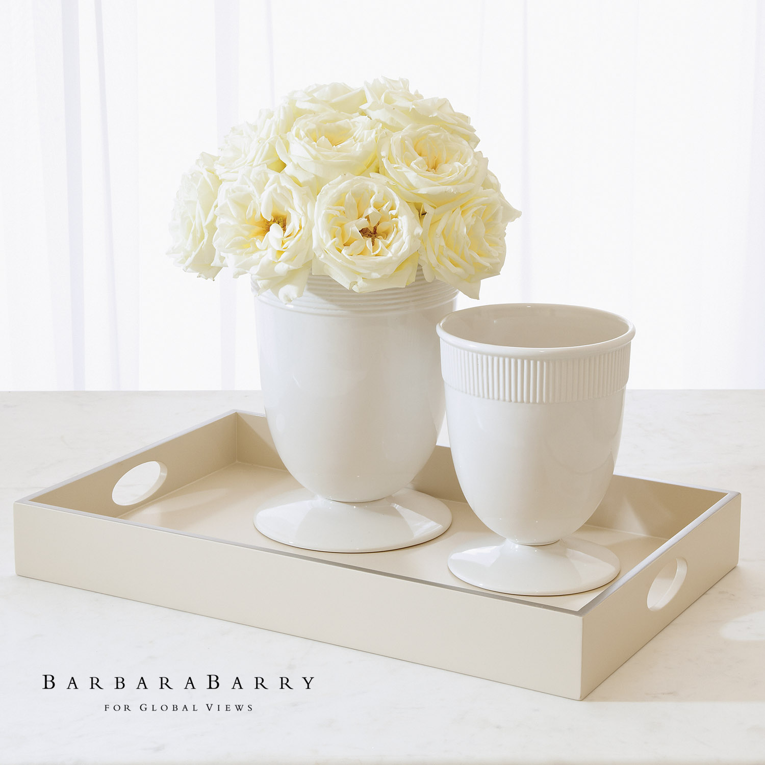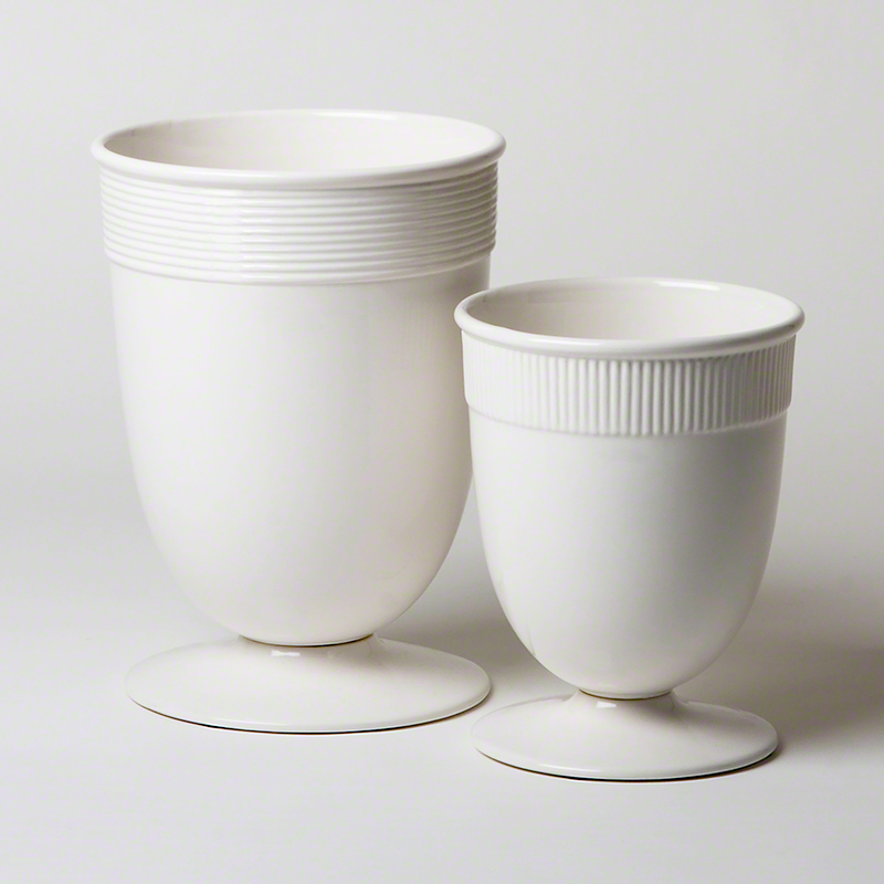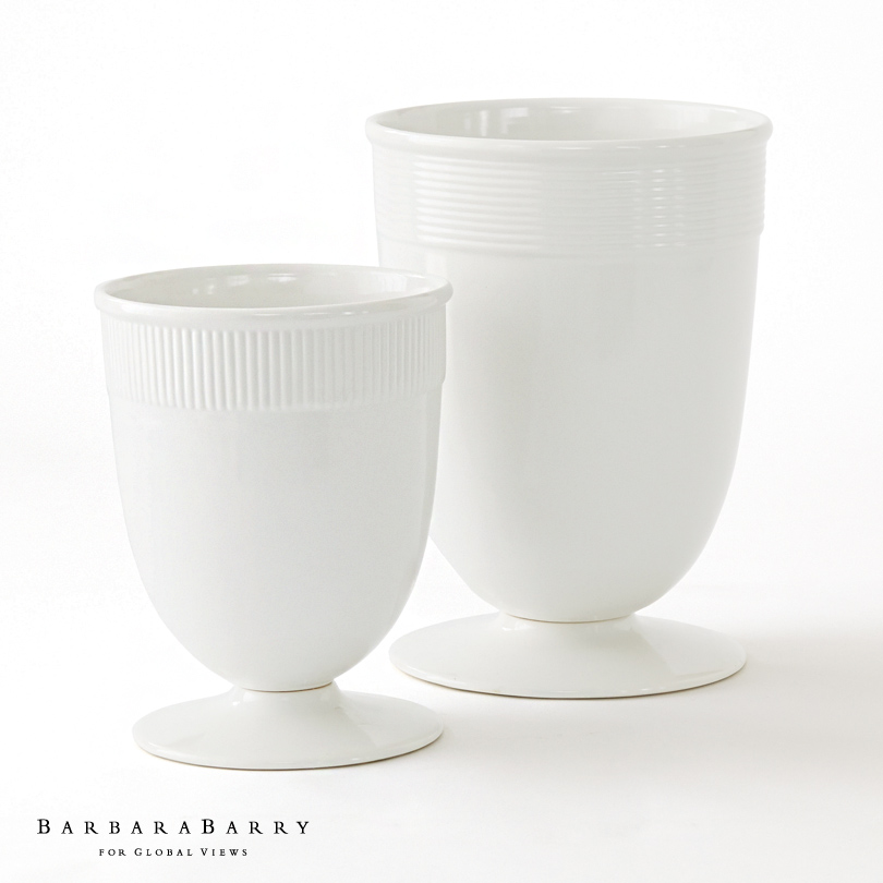 A classic vase in glossy white is a lovely alternative to a glass vessel. It is a high fired porcelain, banded with a rim of subtle striations. This alone or with its larger counterpart adds a sophisticated layer to any room.