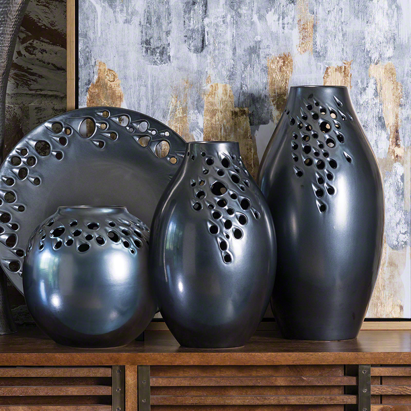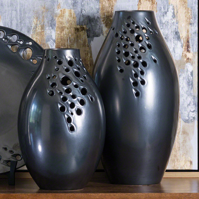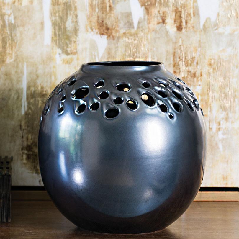 Irregularly placed perforations add an unexpected element to the classic shapes of the Meteor Collection. Made of high-fired ceramic with a satiny graphite finish.