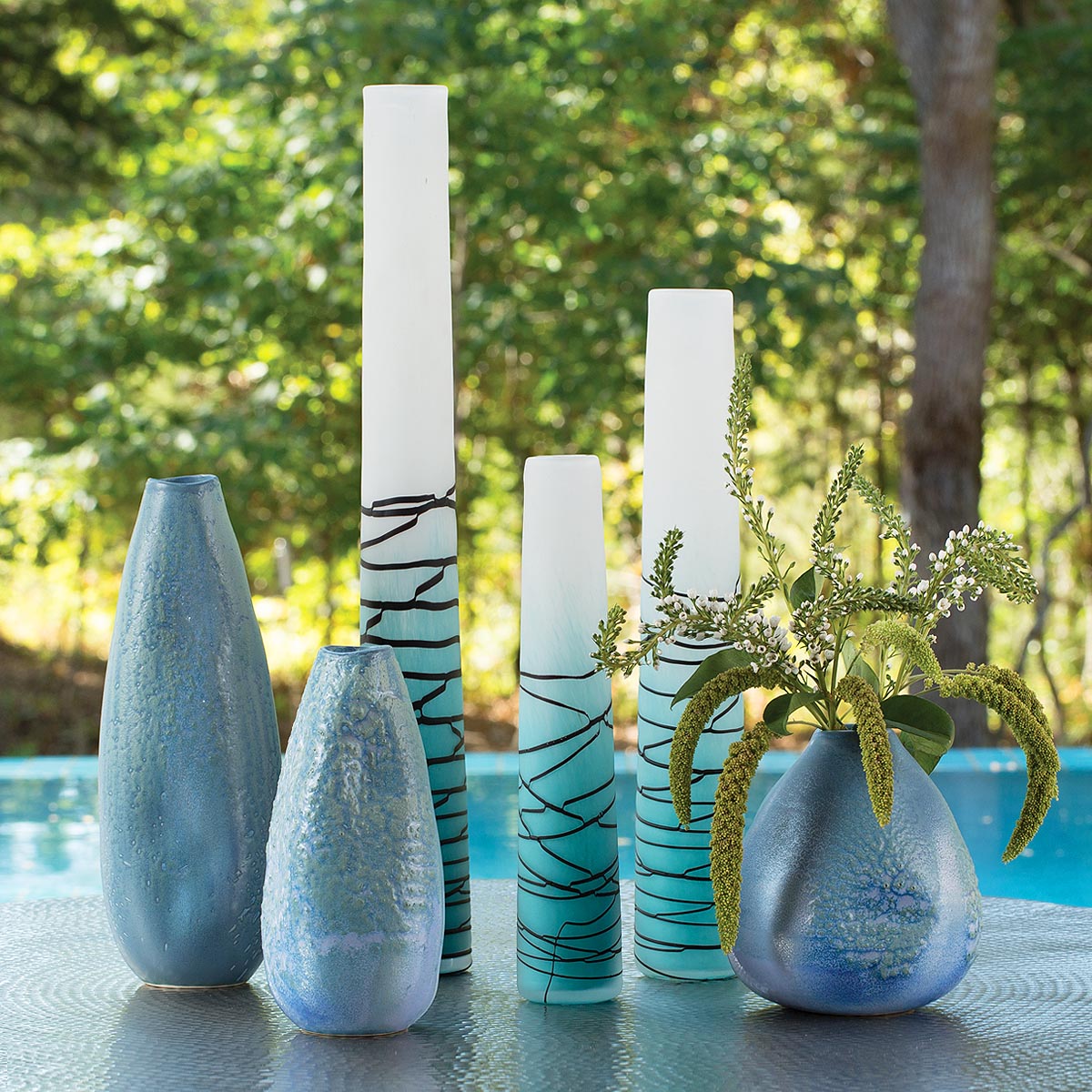The Taffy Vases begin as two-toned ombre clear glass forms. Molten colored glass is swirled randomly over each vase which is then allowed to cool. The final step involves sandblasting the entire vase which frosts the clear glass and wears away parts of the colored swirl to give it subtle variation in color and texture.