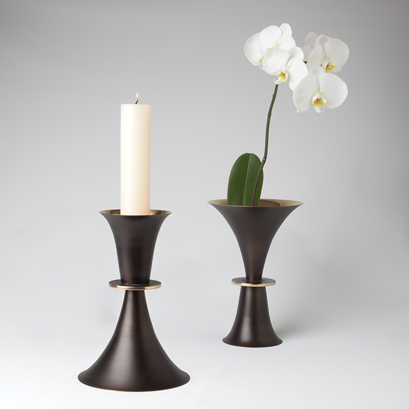 A classic silhouette functions as a candleholder or a vase when inverted. Expertly crafted from one of the world`s finest factories. Polished brass interior; bronze-finished exterior. Holds 2" pillar candle (sold separately).