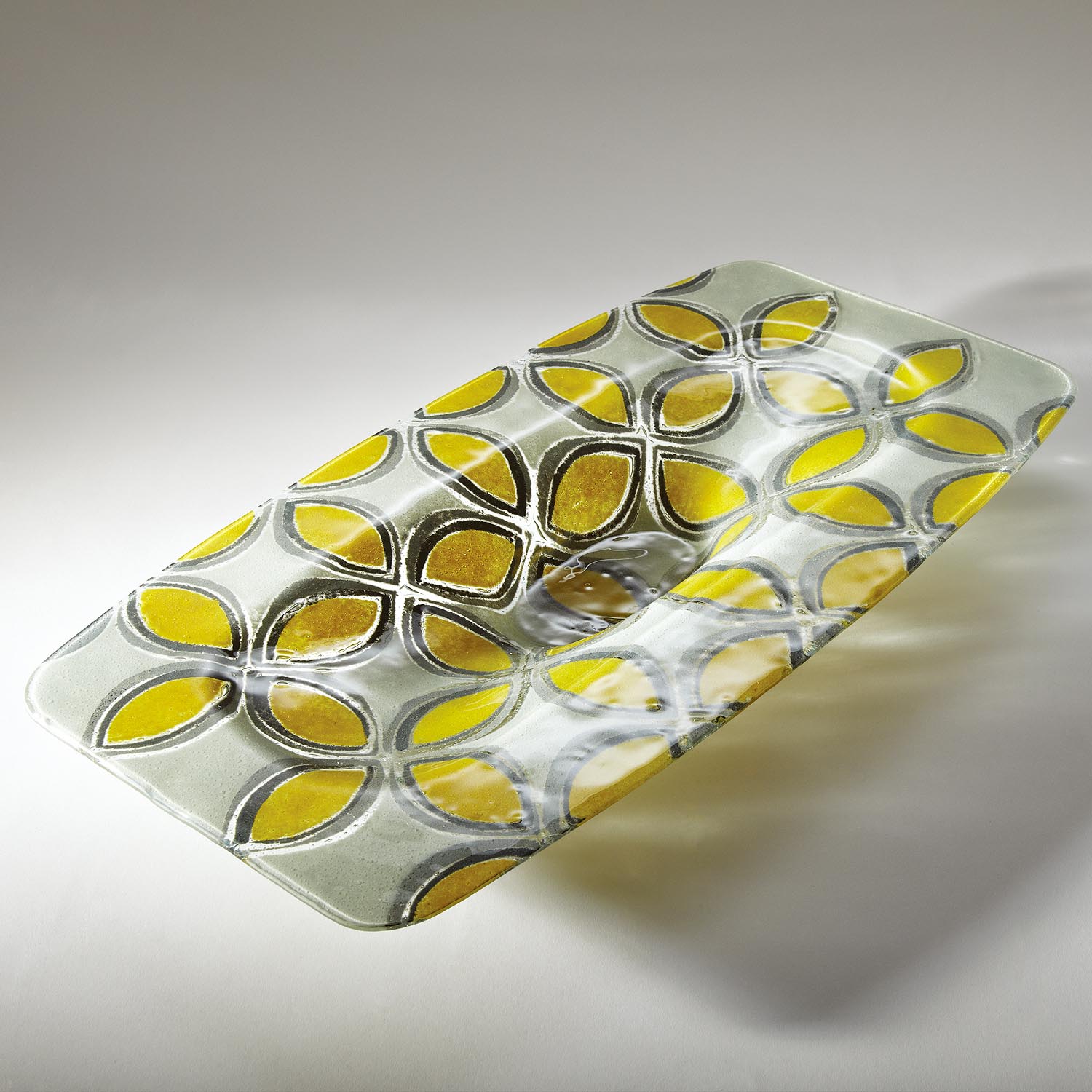 這件作品由葡萄牙的工匠手工製作,採用了在二十世紀中葉流行的融合玻璃技術。裝飾圖案是以手工塗抹的彩色研磨玻璃製成,經烘烤後與透明玻璃底座融合。這種獨特而罕見的技法使裝飾圖案具有永久性和高度耐用性,因此產品可清洗,適合日常使用。這款精美的大圓盤圖案象徵重疊的花瓣或菱形。