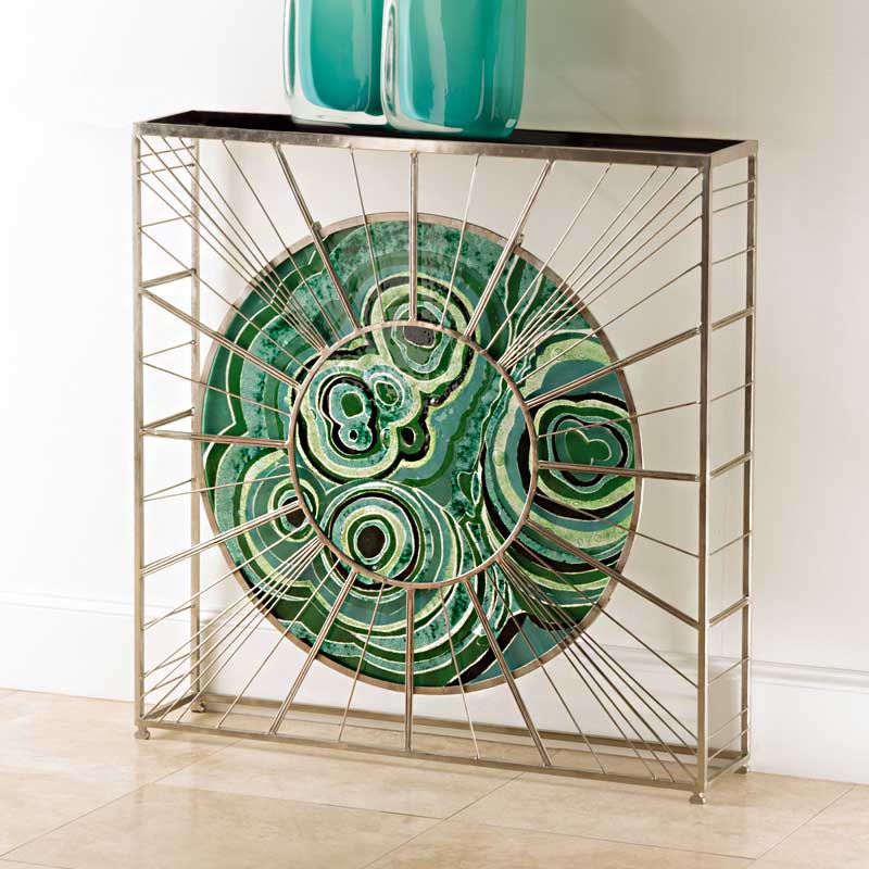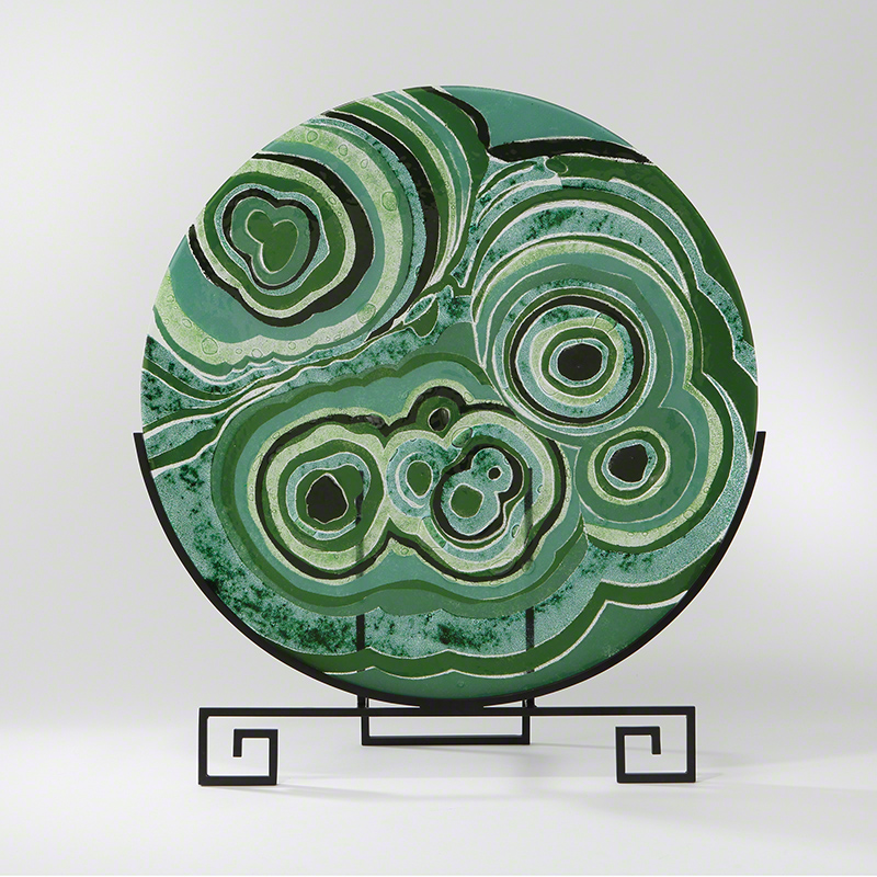 Fused glass charger has hand applied pattern inspired by malachite. These striking pieces are beautiful as decorative accents or as serving pieces. This oversized plate fits inside our Radial Console.