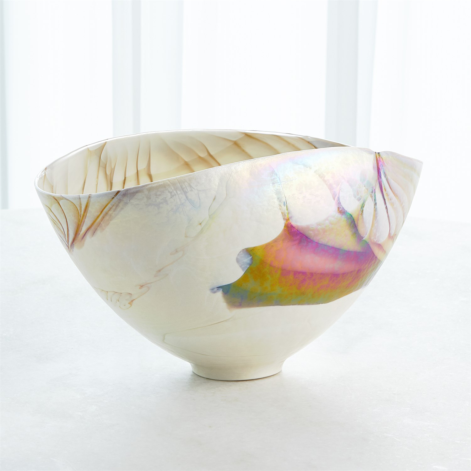 Italian glass artisans on the island of Murano form these one-of-a-kind art glass items utilizing a centrifuge process that spins molten glass in large copper bowls of various sizes. The shapes are formed after the glass stops spinning and the artisans begin to shape, mold, cut, and reheat the glass into the shapes you see here. After a long annealing process, the glass is cool, stable, and able to be packed and prepared to ship. No two pieces will be the same.