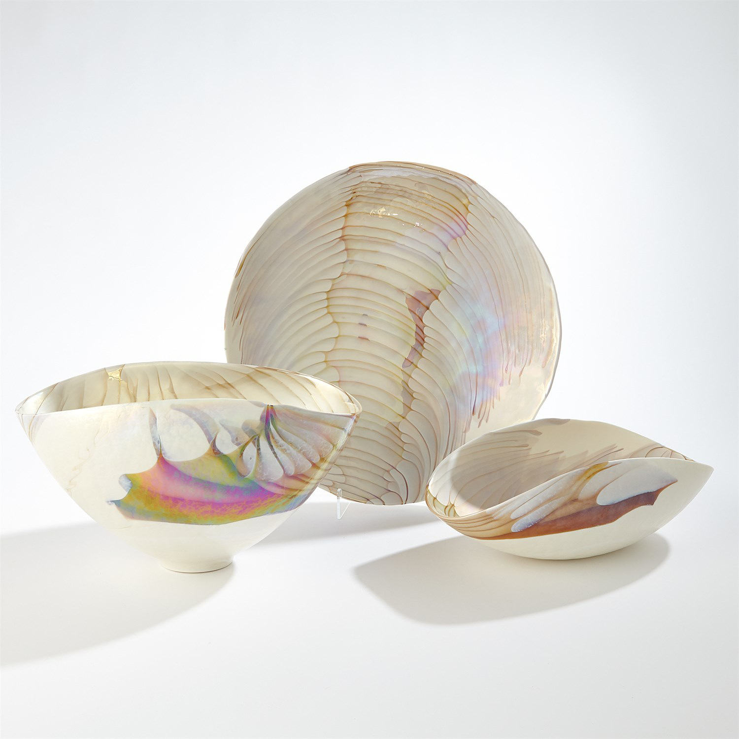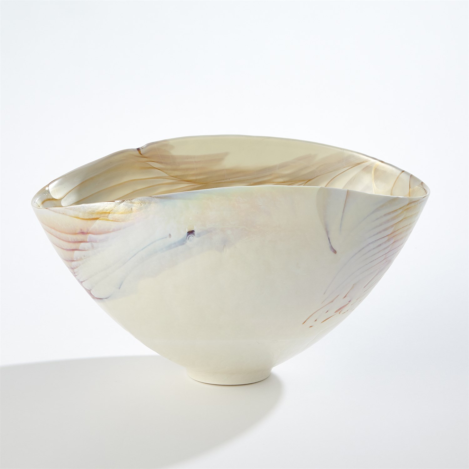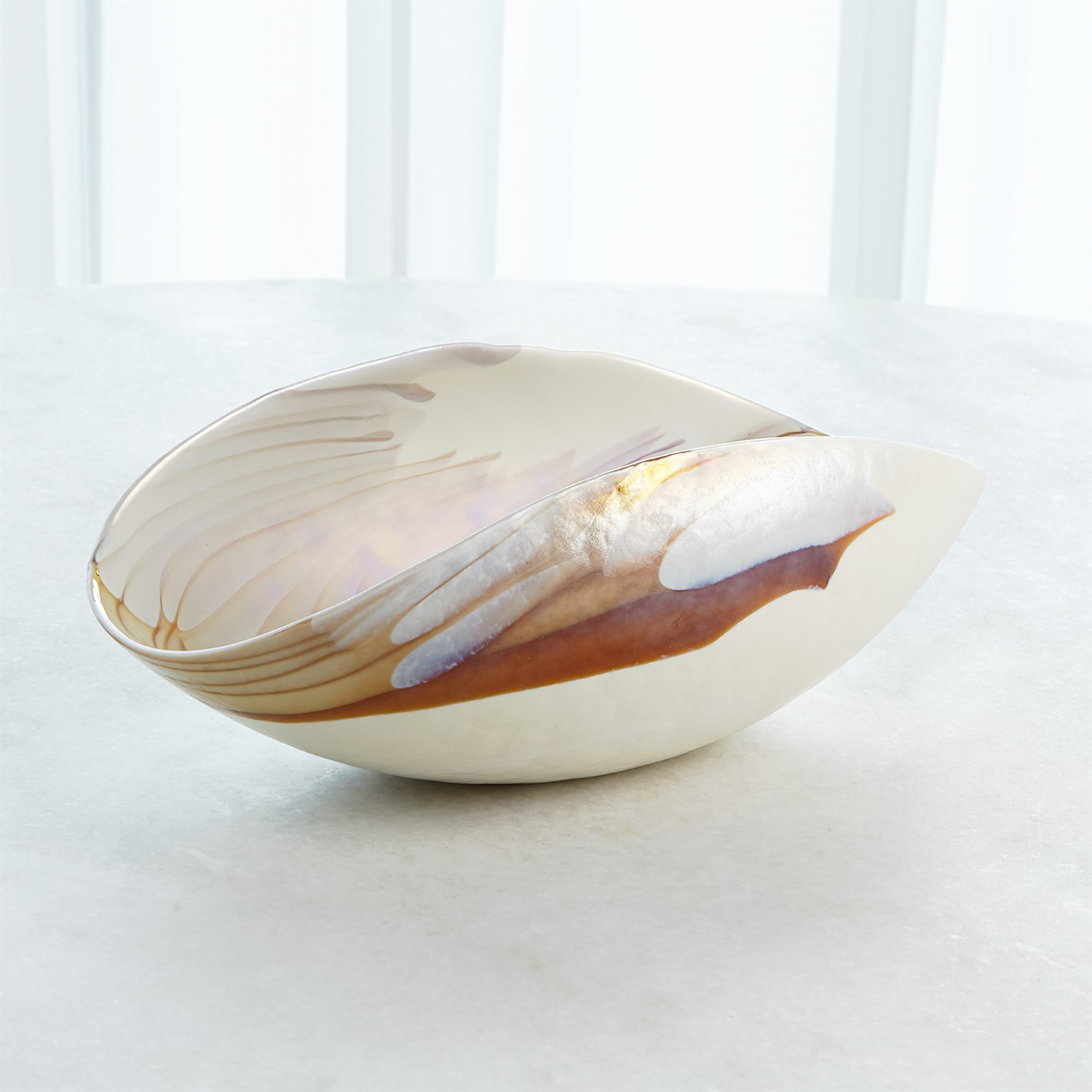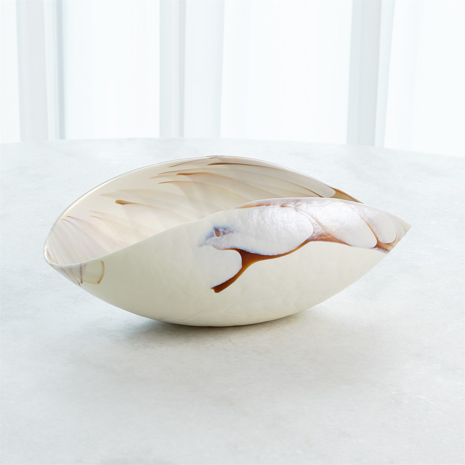 義大利手工製成的象牙色橢圓玻璃碗系列,由義大利穆拉諾島上的藝術玻璃匠師利用離心機工藝將熔融玻璃旋轉到各種尺寸的大銅碗中,當玻璃停止旋轉形成形狀之後,匠師們開始將玻璃塑形、切割和重新加熱,接著經過長時間的降溫處理程序,讓玻璃變得涼爽、穩定之後,形成獨一無二的藝術玻璃,而且沒有兩件會是相同的。