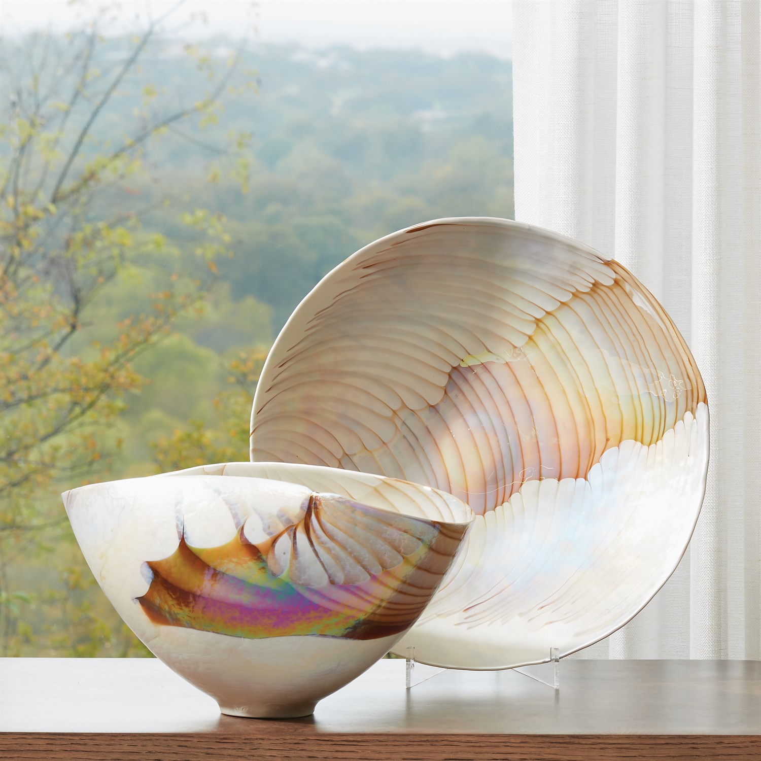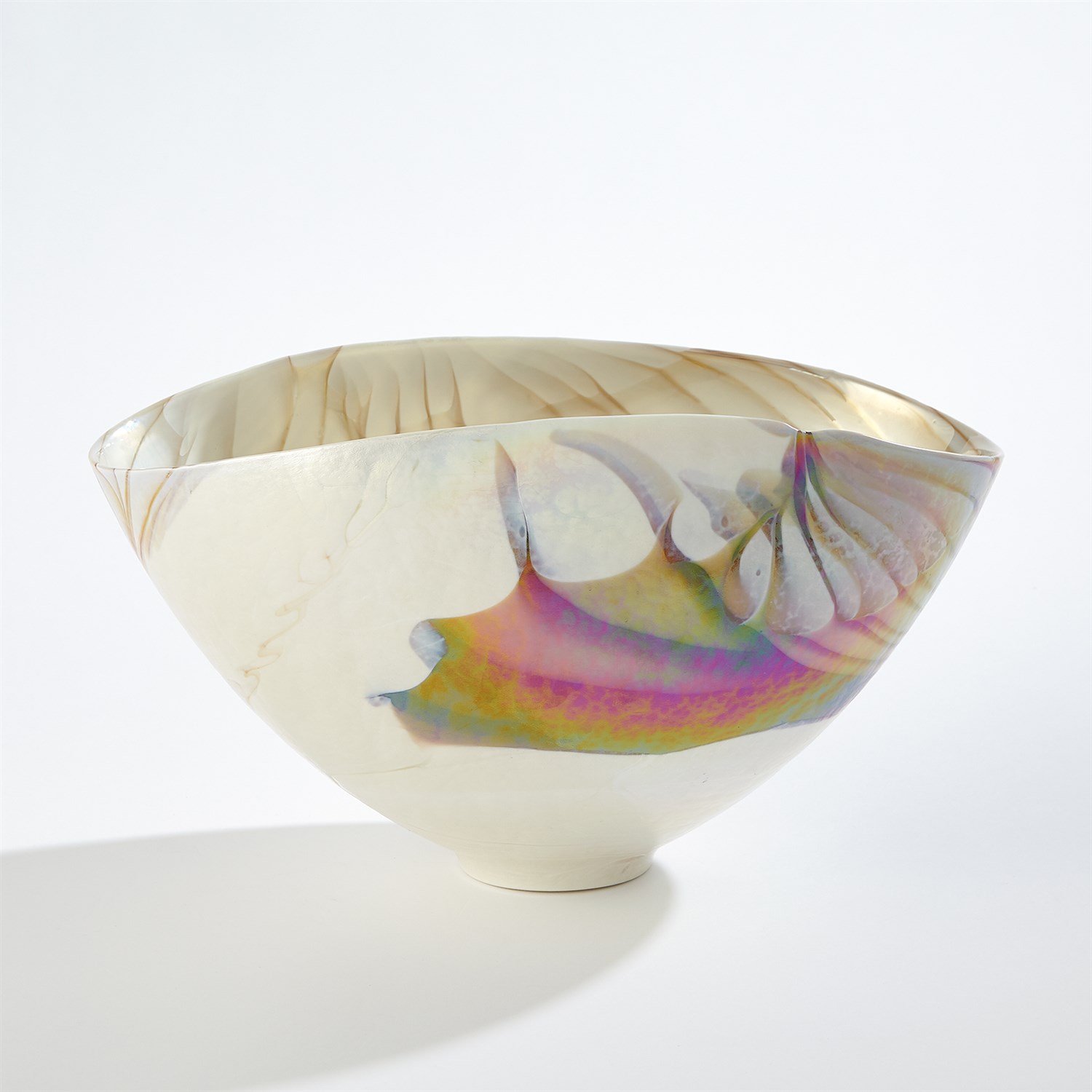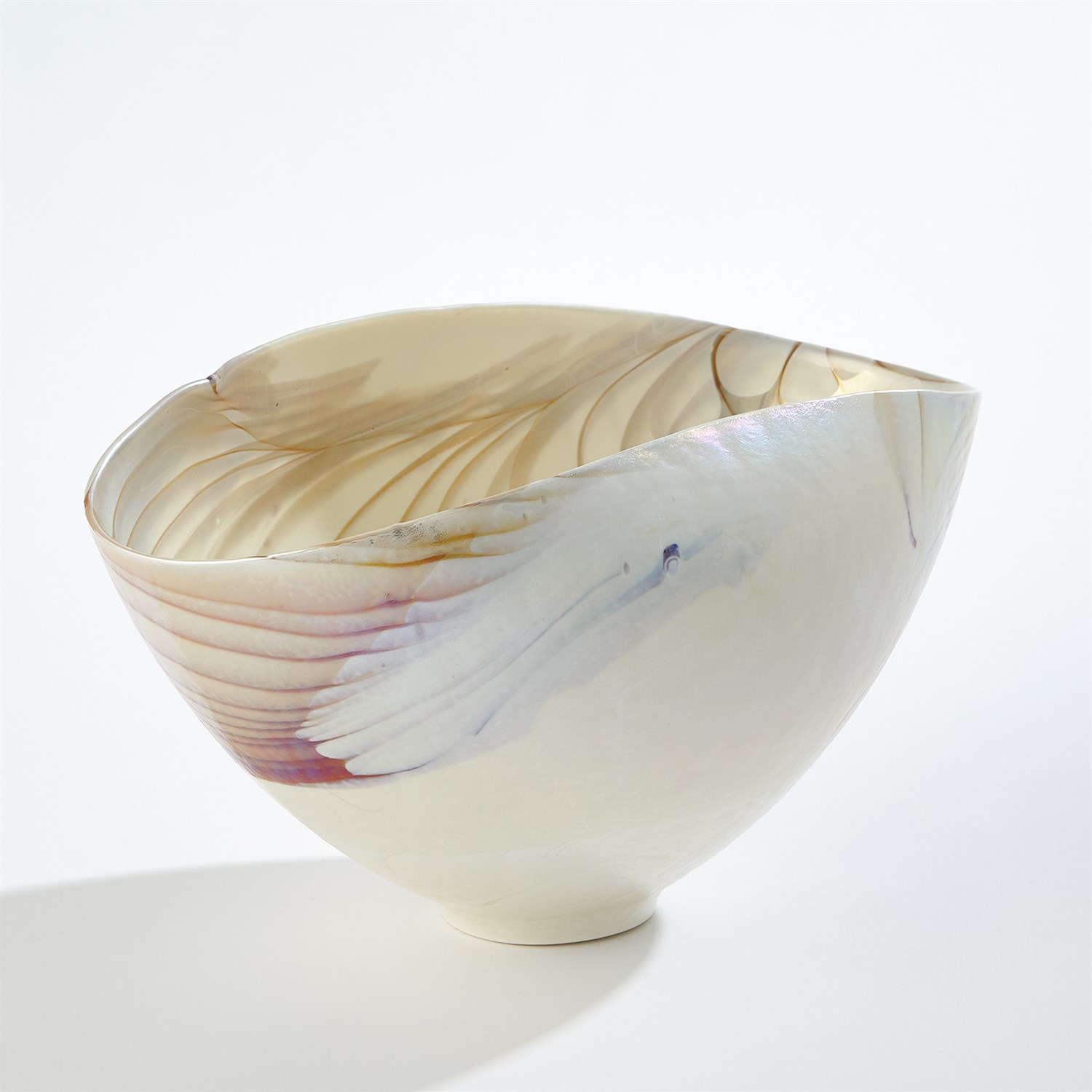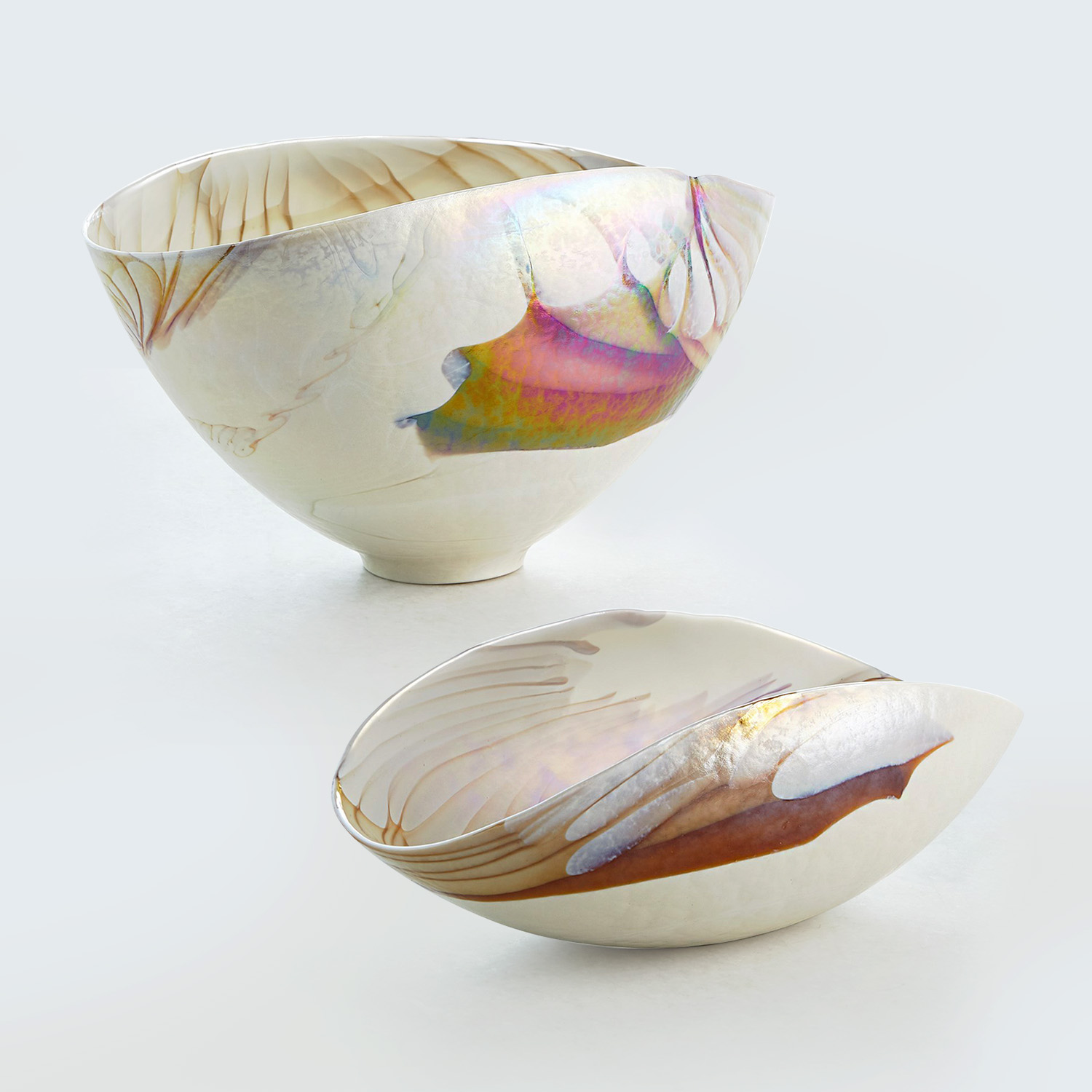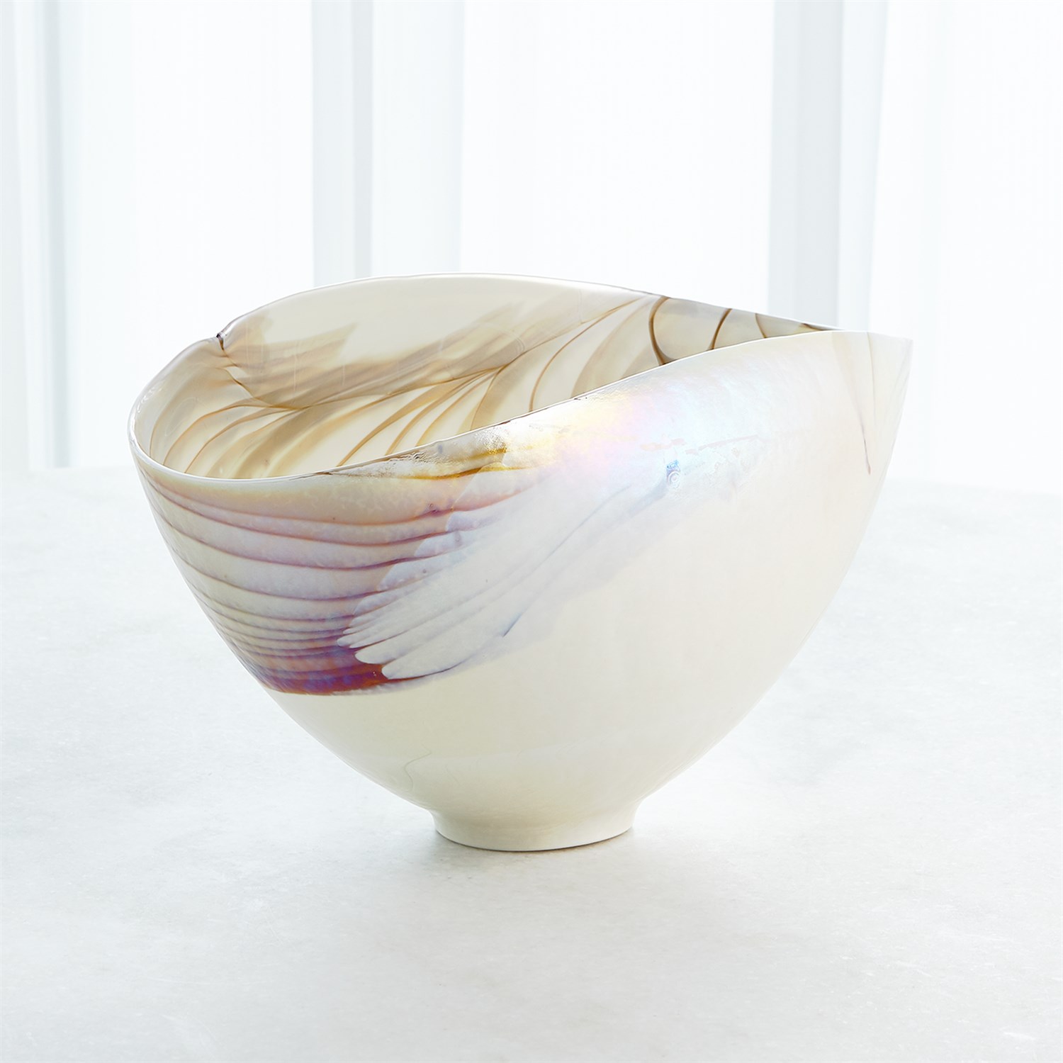 義大利手工製成的象牙色橢圓玻璃碗系列,由義大利穆拉諾島上的藝術玻璃匠師利用離心機工藝將熔融玻璃旋轉到各種尺寸的大銅碗中,當玻璃停止旋轉形成形狀之後,匠師們開始將玻璃塑形、切割和重新加熱,接著經過長時間的降溫處理程序,讓玻璃變得涼爽、穩定之後,形成獨一無二的藝術玻璃,而且沒有兩件會是相同的。