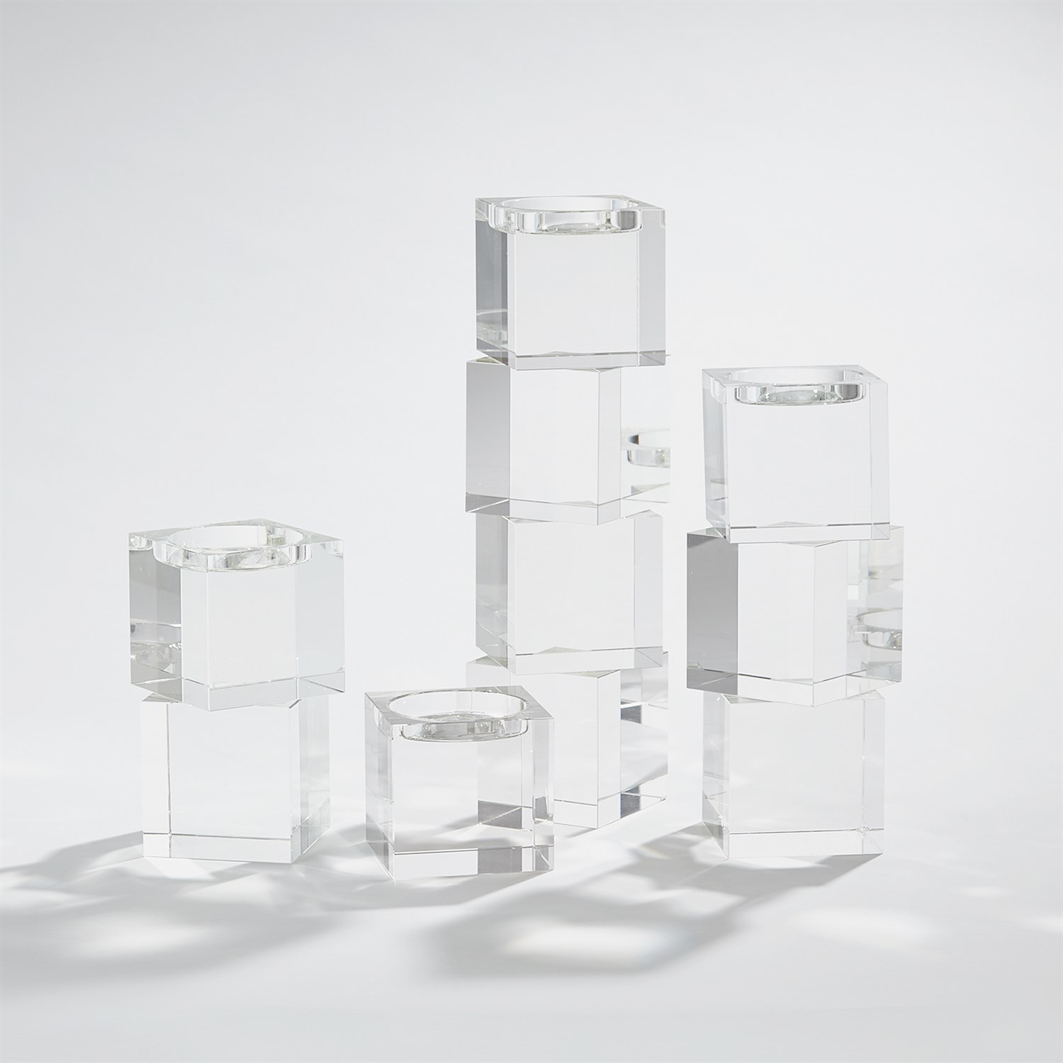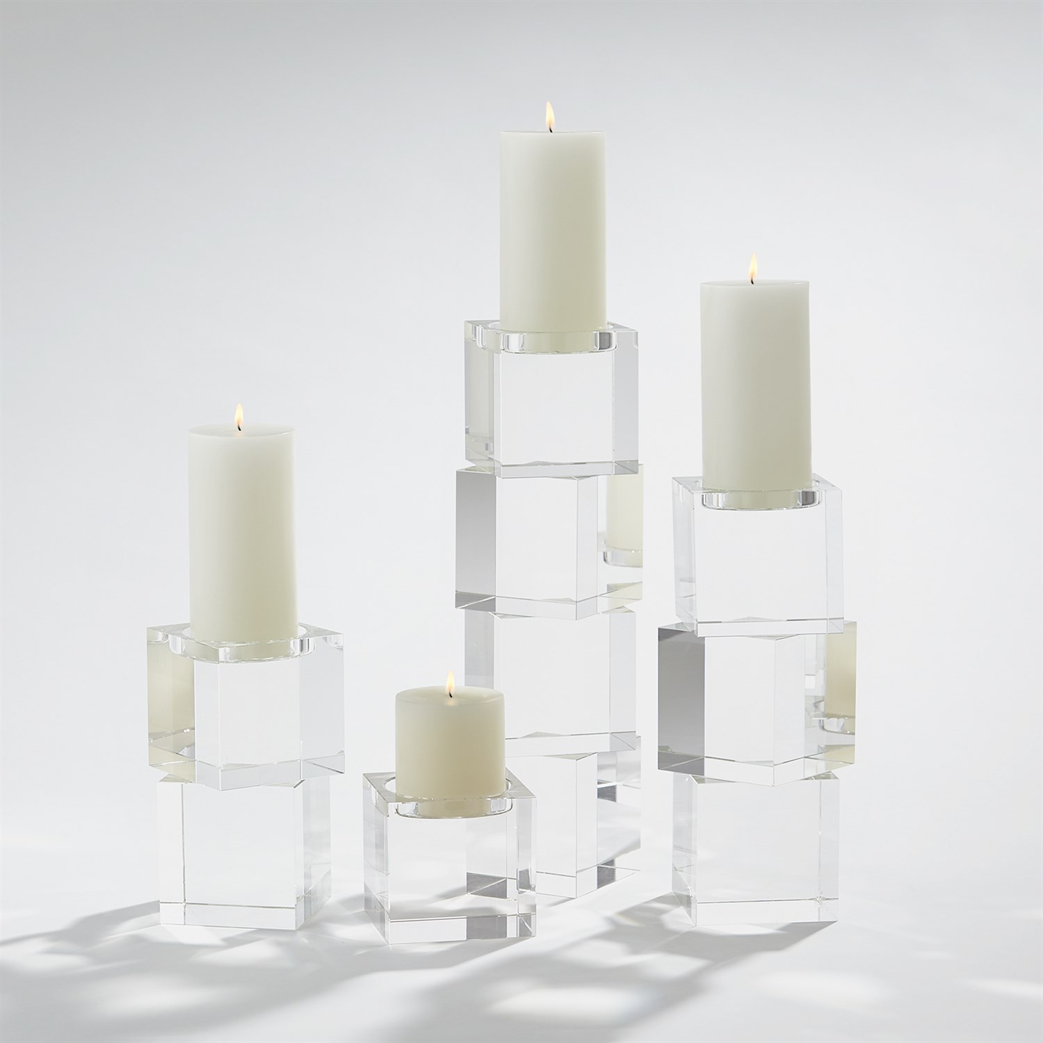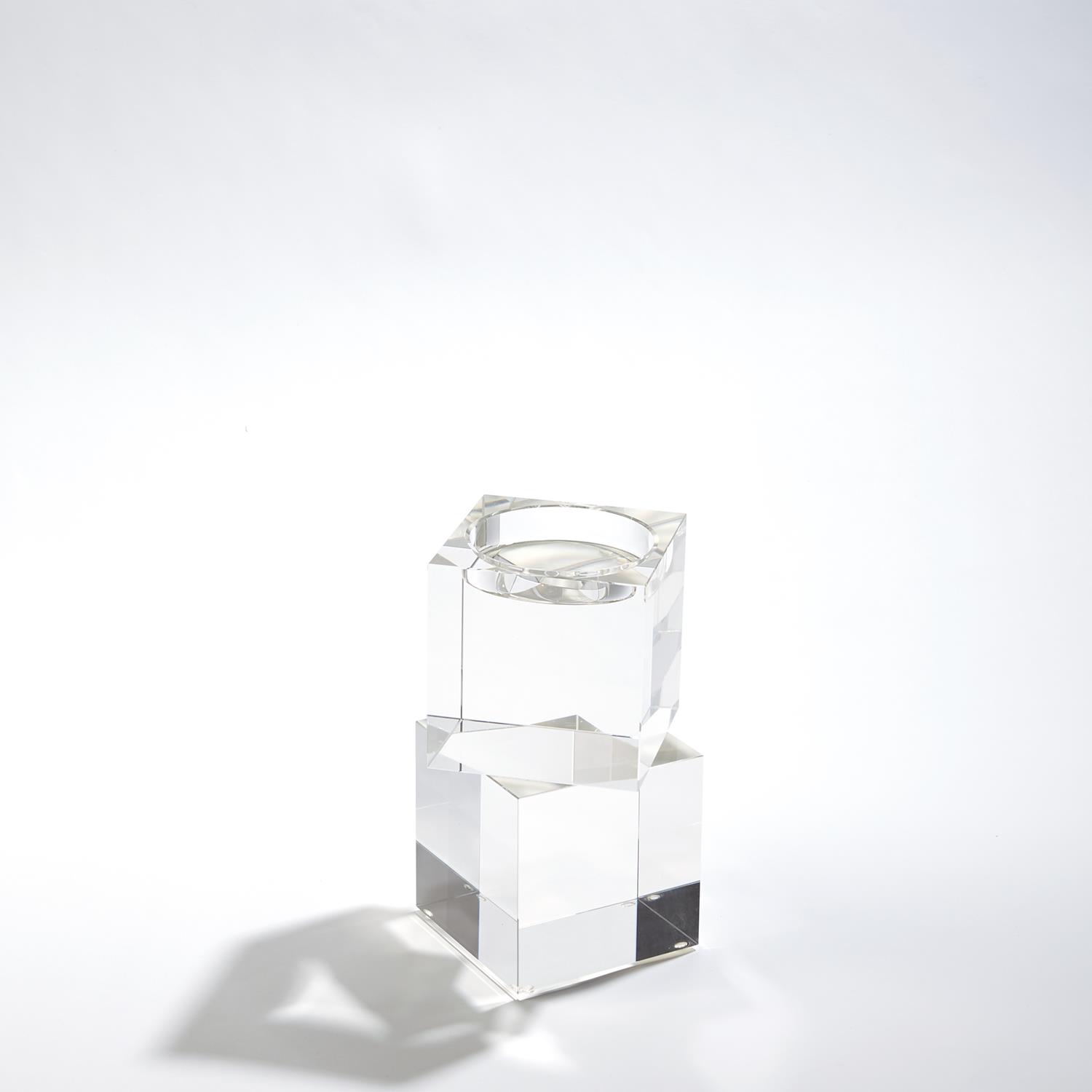 Polished lead crystal cubes are stacked in a stair step to create over scale graceful candleholders. Please do not place in direct sunlight, crystal can magnify the light of the sun and potentially cause a fire hazard.