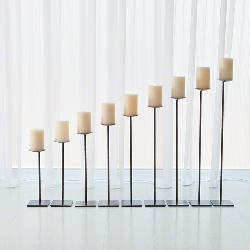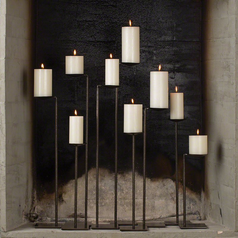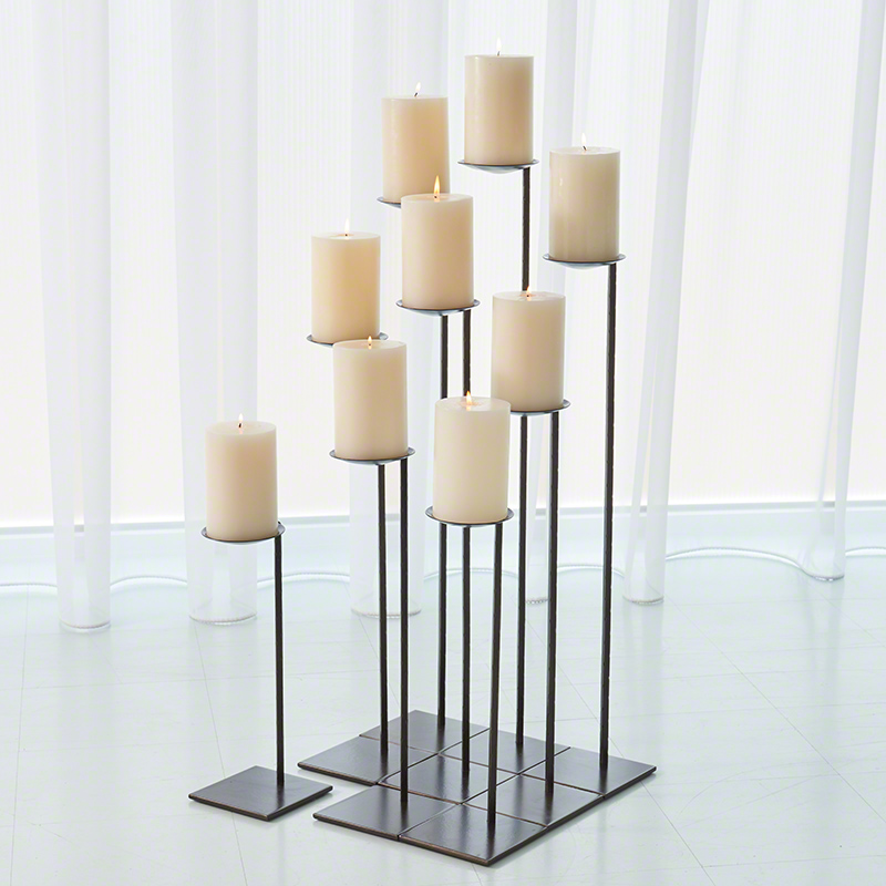 Each of the nine iron cantilevered candleholders is a different height making for endless design possibilities. Each holds a 4" Pillar Candle (sold separately).
