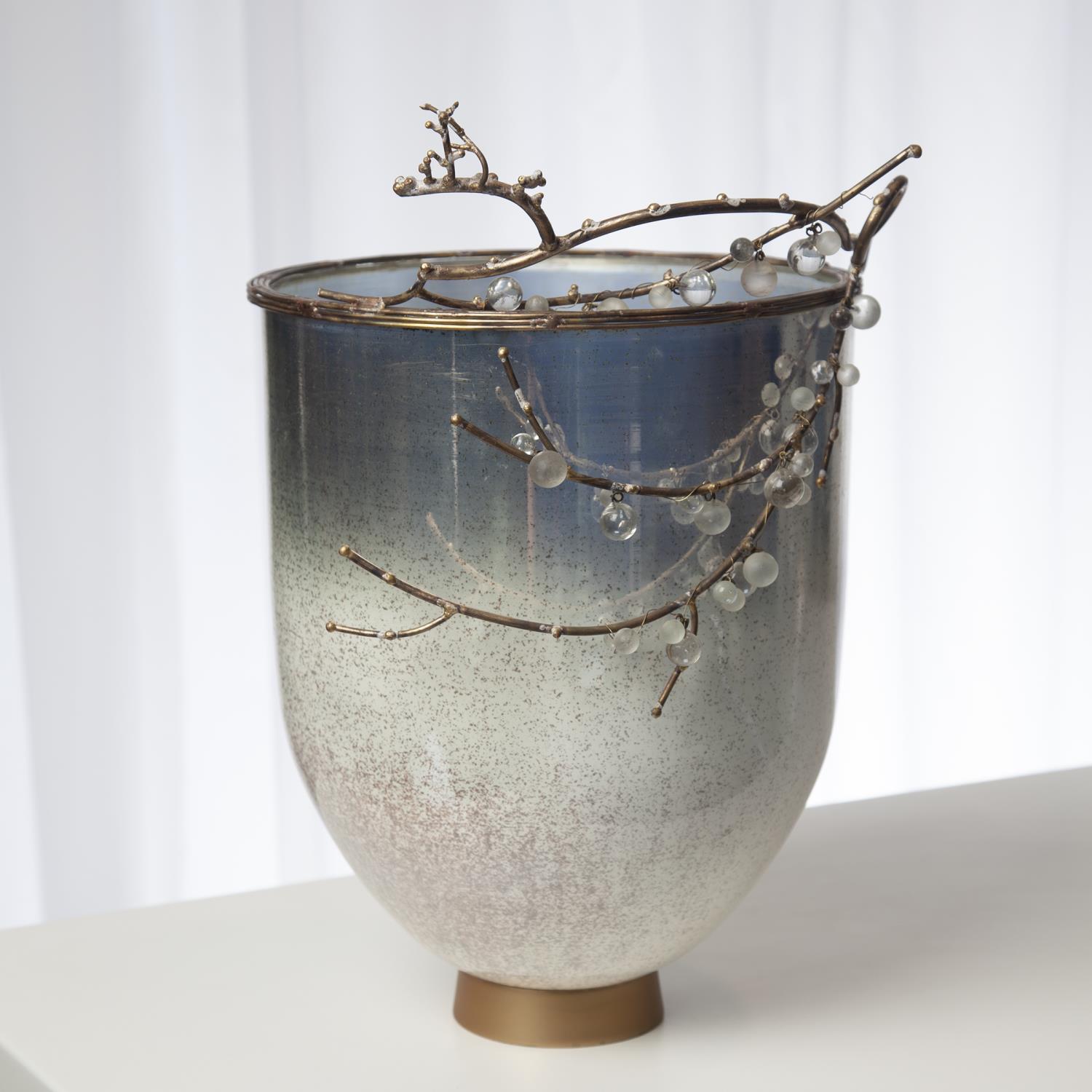 Forest 系列的玻璃器皿因化學反應呈現出獨特的質感效果。內層為水銀玻璃質地,逐漸過渡至雪白紋理的外層,展現豐富層次與細膩光澤。底座為霧面仿古黃銅,邊緣則點綴著玻璃珠飾,細節精緻迷人。僅供裝飾用途,非實用容器。