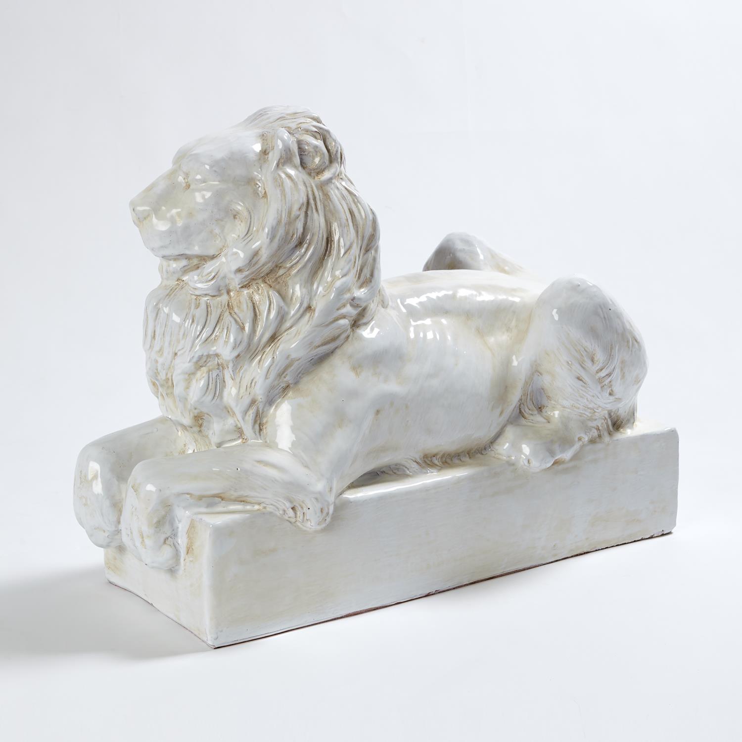 From the mind and imagination of George Sellers, our in-house sculpture and design director and a mound of clay comes a carved original model of this reclining lion. The original was then cast in plaster and sent to a factory in Italy to be produced in a terracotta based ceramic material in the technique Italians call "calco", whereby terracotta ceramic is packed when wet into a detailed mold. Drying over time, the terracotta ceramic pulls away from the wall of the mold and removed to be fired in a 950 degree kiln, then fired a 2nd time after being glazed in our signature antique white glaze. A design trend and direction we believe in as a company is a return to classicism as inspiration for the future of home decor.