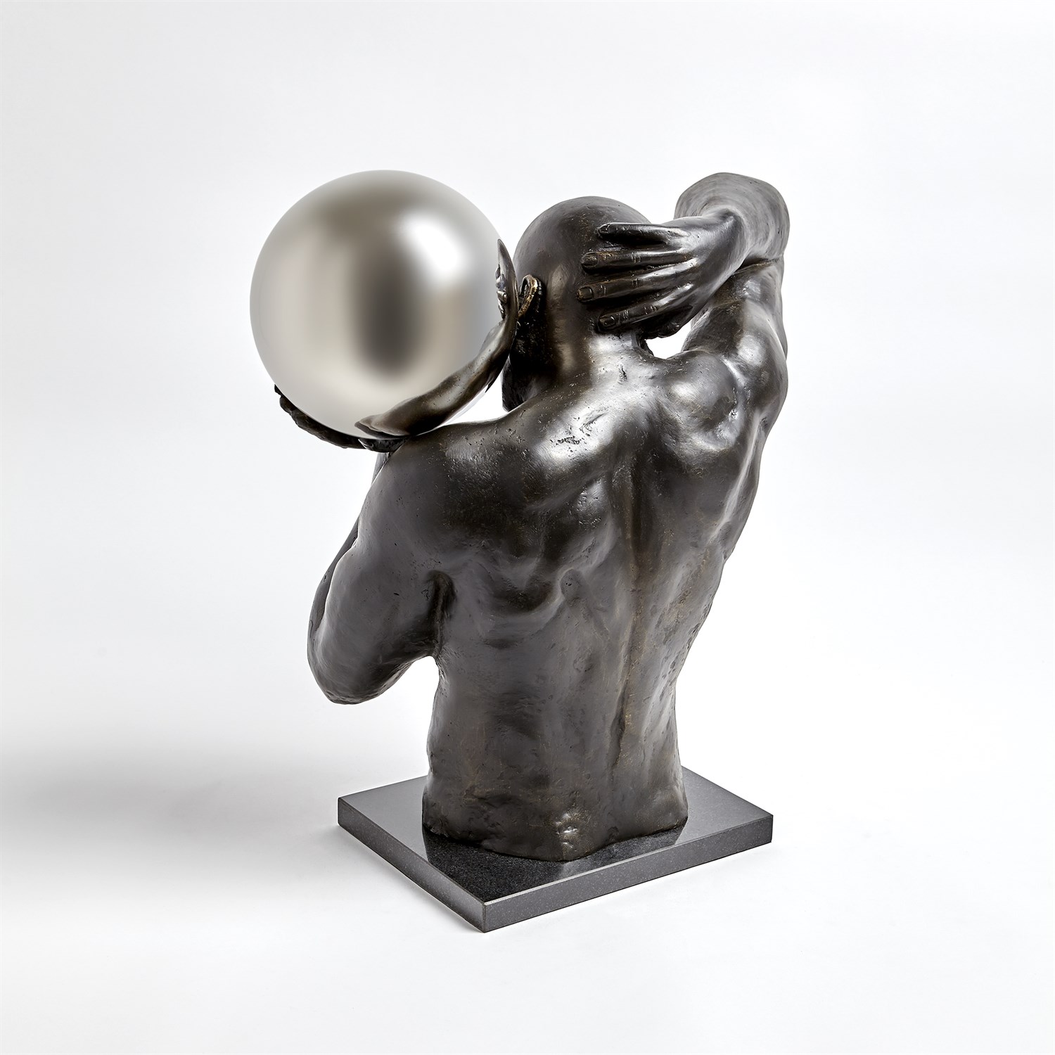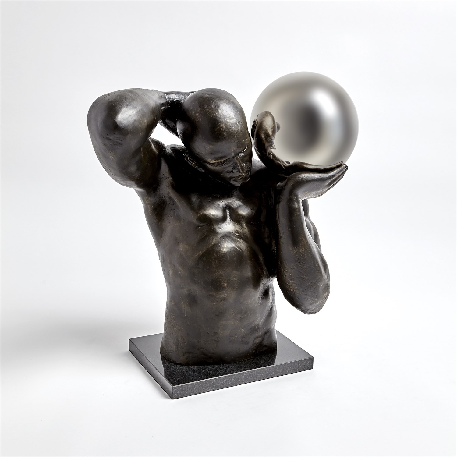 Sculptural objects that take direct reference from the human form have always been appealing. Here we feature an almost life size pair of Shot Put athletes in the act of putting a large ball one from his right hand, one from his left hand the perfect pair. Made from cast iron on black granite bases the muscular forms make a strong statement. The balls are made from stainless steel.