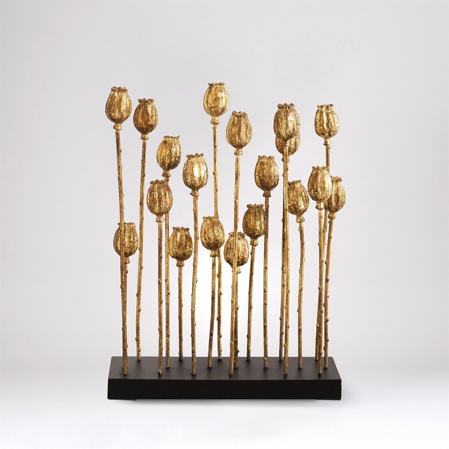 The chorus of flower buds makes a beautiful sculptural statement, referencing organic forms and the natural world. A dimensional finish is achieved with hand-applied gold metal leafing. These pieces would be beautiful on mantels, consoles, and sofa tables, as well as in dramatic tablescapes for entertaining.