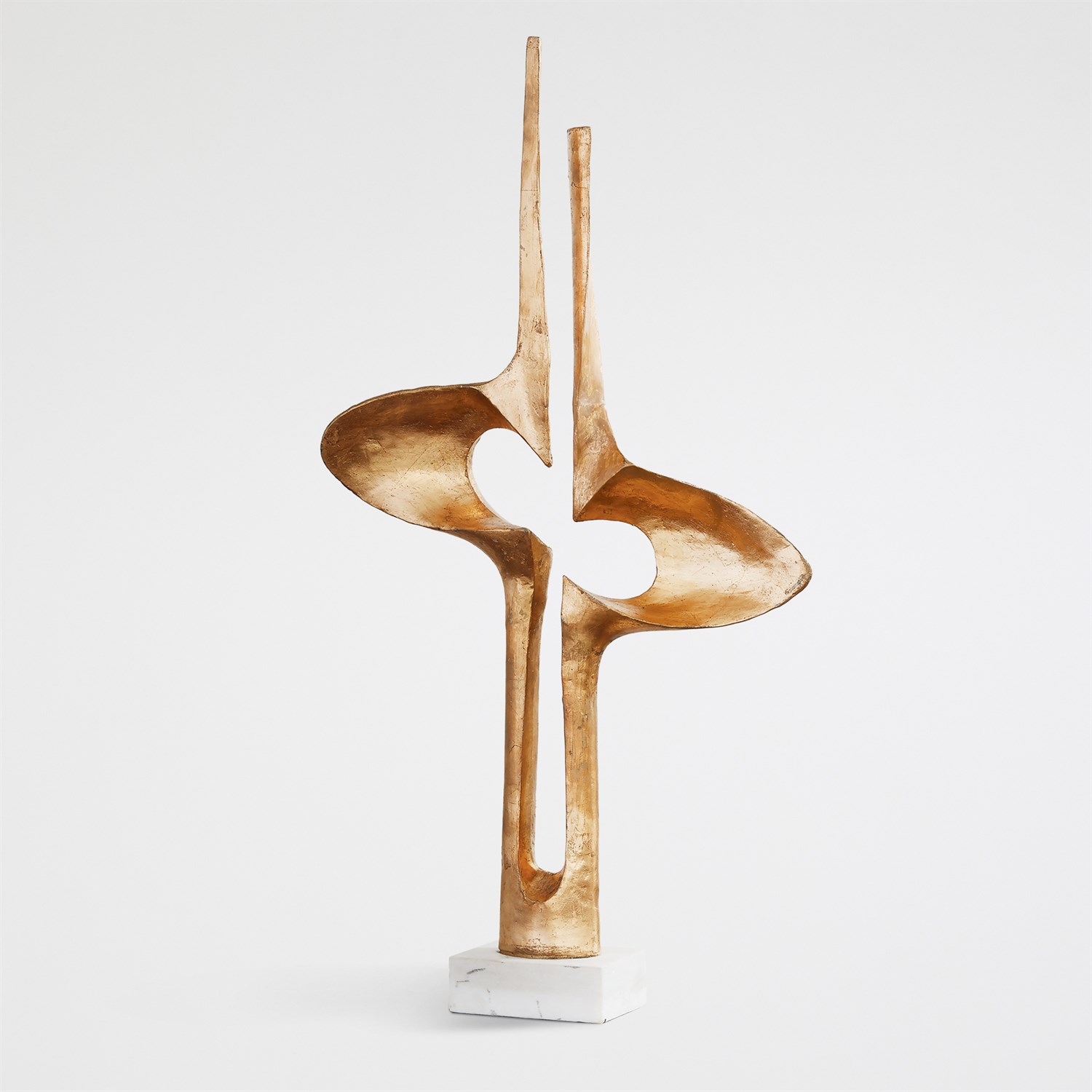 Dramatic cast iron sculpture of two interacting figures. We figured their closeness paired with their similar shape leads them to be brother and sister. Gold leaf finish, sits atop a white marble base for stability.