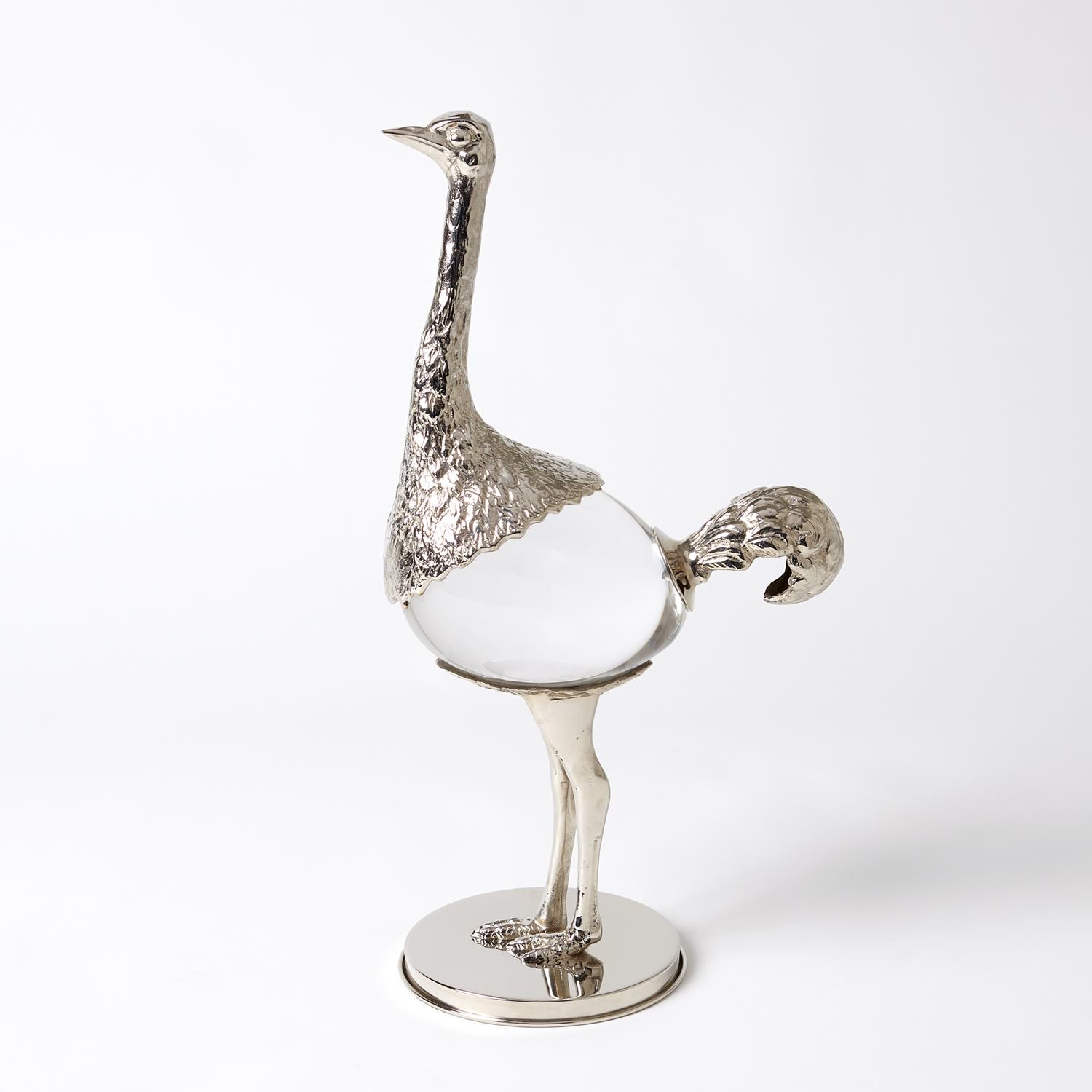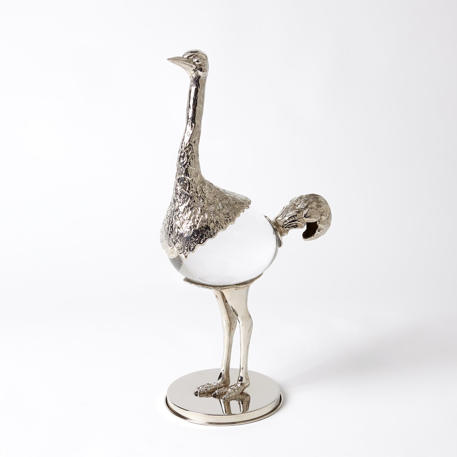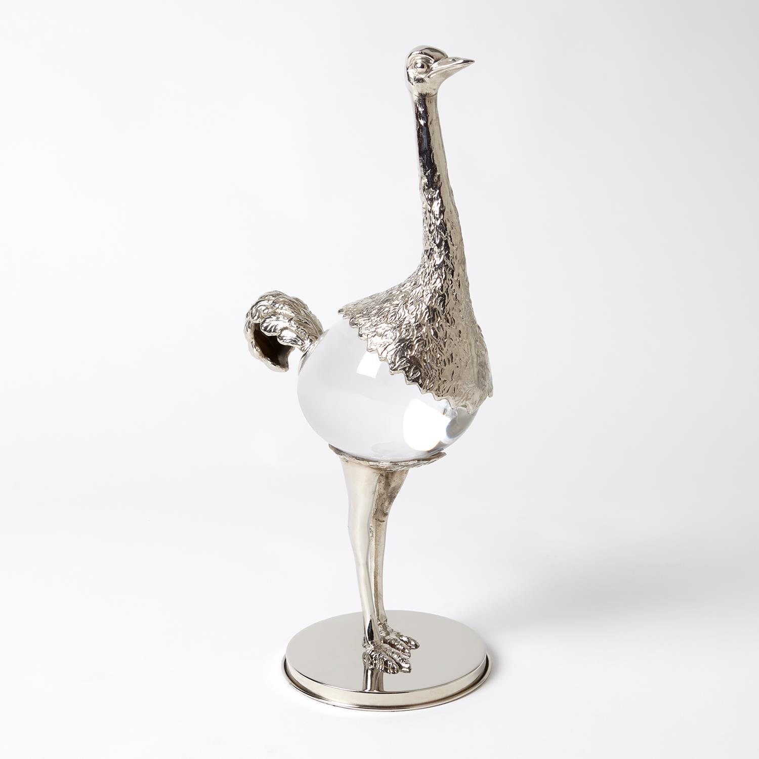 Sand cast brass with a nickel plated finish and crystal join forces to create an elegant Ostrich sculpture. Nickel plated sheet brass base supports the weight of the ostrich and his crystal shaped body.